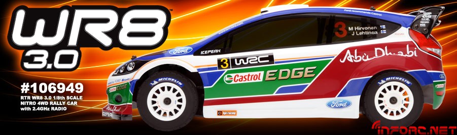 Combinando la durísima transmisión del Bullet 3.0, con el look realista del Ford Abu Dhabi WRC tenemos como resultado este automodelo RTR. El WR8 mantiene los diferenciales ultra duros con tracción a las cuatro ruedas, doble disco de freno y transmisión con rodamientos en todos los puntos del Bullet y añadiendo el nuevo motor Nitro Star G3.0, embrague de competición, nuevas geometrías de suspensiones, barras estabilizadoras más gruesas y neumáticos para la ocasión se ha conseguido un auténtico coche de rally. Disponible en versión RTR.