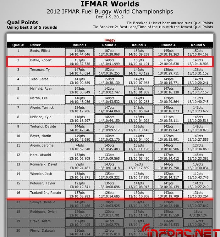 Tras llover intensamente a partir de las 9 am hora local, se hicieron varias reuniones que llevaron a la directiva de IFMAR a suspender definitivamente la Q6, y por lo tanto usar tres de cinco resultados para clasificarse. Con ese acuerdo, las cosas quedarían con Elliot Boots/Kyosho MP9 en la pole saliendo primero desde su semifinal. Le sigue Robert Batlle/ Mugen MBX7, que sale primero también pero desde su semifinal.