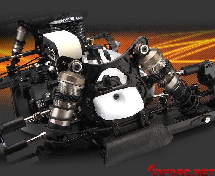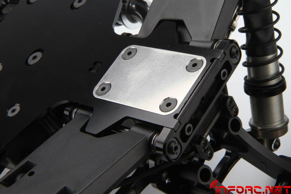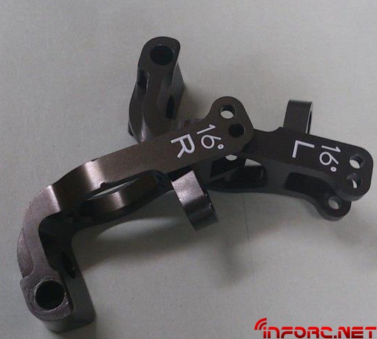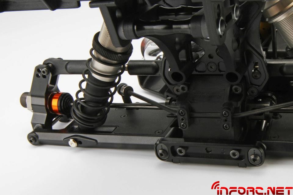 – Trapecios modificados, incluyendo un agujero más de ajuste para la inclinación del amortiguador. (Muy parecidas a las de Kyosho)