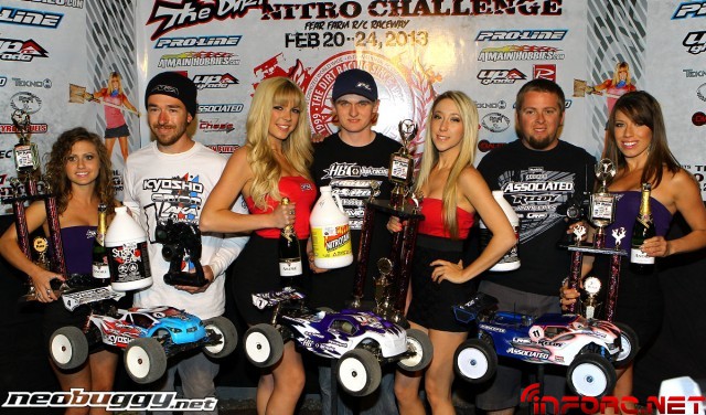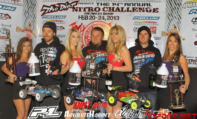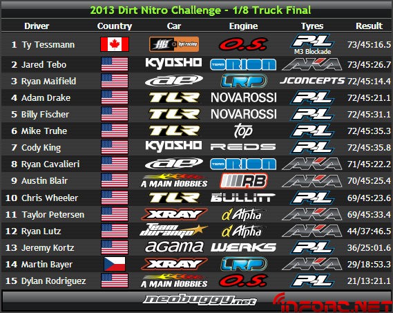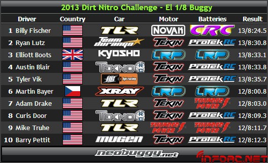 Finalmente el tiempo permitió que se celebrase la Dirt Nitro Challenge 2013 durante este fin de semana, en el que Ryan Maifield se alzó con la victoria en la categoría 1/8 Buggy, tras salir airoso de los golpes que hubo en unos lances durante la primera vuelta, donde se vieron perjudicados Jared Tebo, y Reno Savoya. Tras liderar Elliot Boots durante 9 vueltas la final, una rotura en su Kyosho lo dejaría sin opciones a ninguna plaza elevada en la final, una verdadera lástima ya que como siempre ha mostrado una conducción espectacular aunque tal vez poco cuidadosa. Tras esta avería quedó la lucha por el podio entre Cavalieri y Tebo, llevándose el segundo puesto el piloto de Kyosho, Tebo.