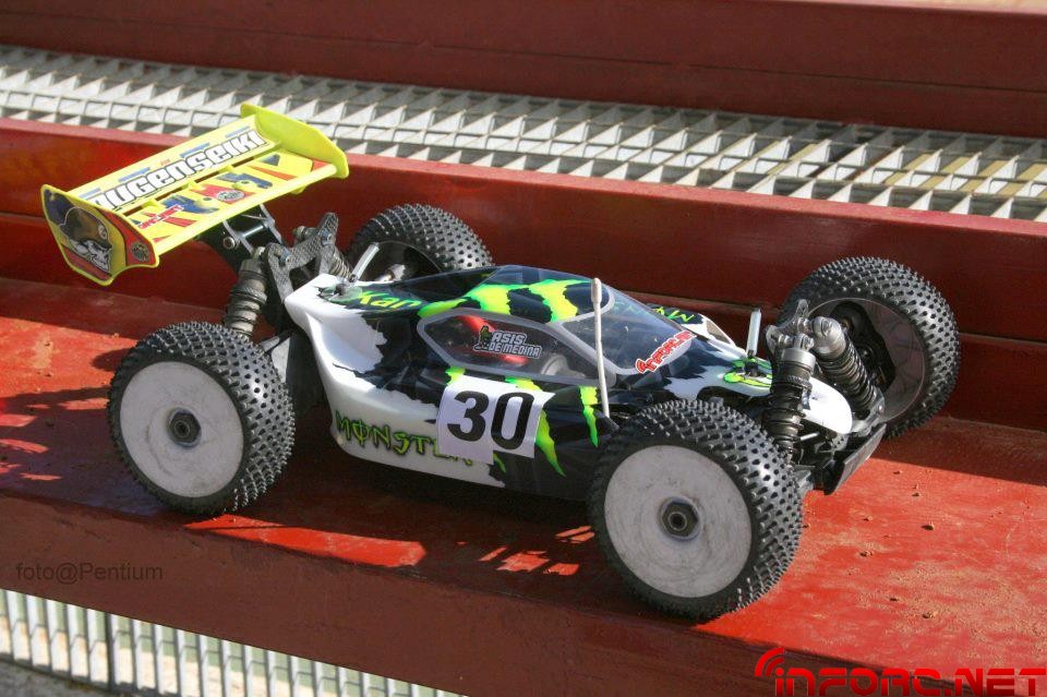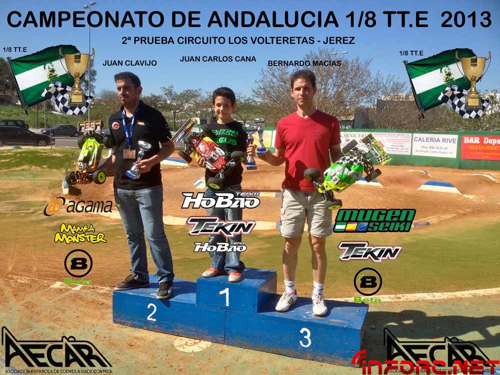 Magnifico tiempo para un dia de carreras el que tuvimos en Jerez, con una asistencia fantástica contando con 27 pilotos y un nivel muy muy alto. Entrando en lo “deportivo” vimos como Juan Martin “Mondeño” nos sorprendia a todos en la primera manga siendo el único capaz de dar 14 giros al ratonero circuito Jerezano. Esta primera clasificatoria se la llevo Juan Martin, seguido de Clavijo, Palomeque y Juan Carlos Canas “Carlitos”. En las siguientes mangas “Carlitos” y su Hyper 9 se mostraron intratables como siempre, y es que el de Hobao tiene un ritmazo increíble!!. La parrilla de la final A al final estaría formada por: Juan Carlos Canas, Juan Martin “Mondeño”, Juan Clavijo, en el top 3 de salida. Haz clic aquí para ver el resto de tiempos y parrillas de salida.