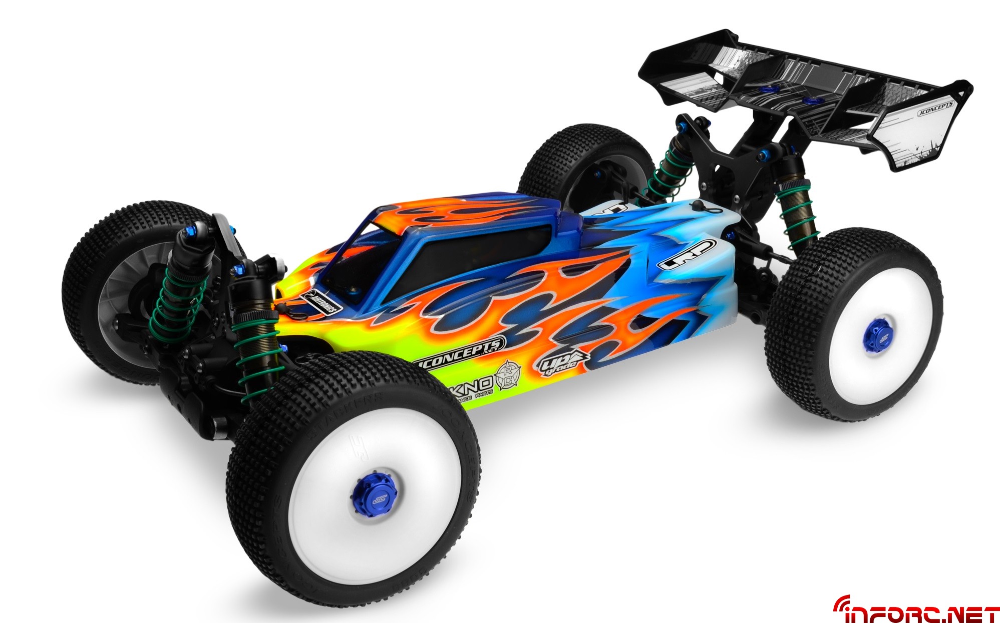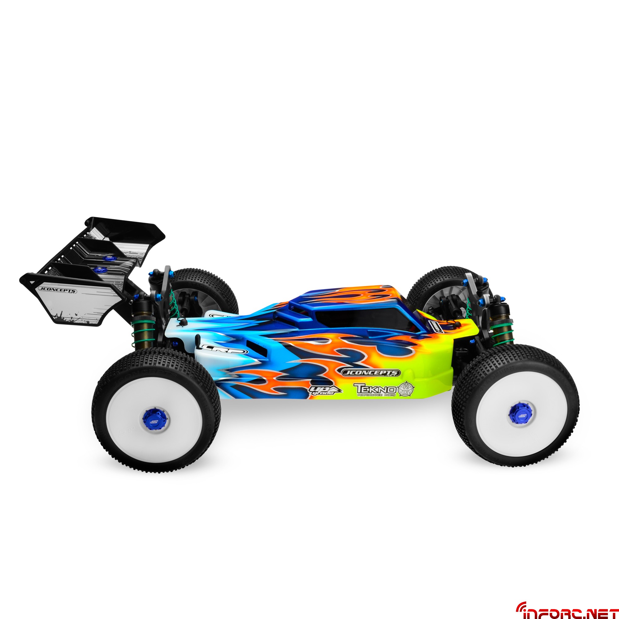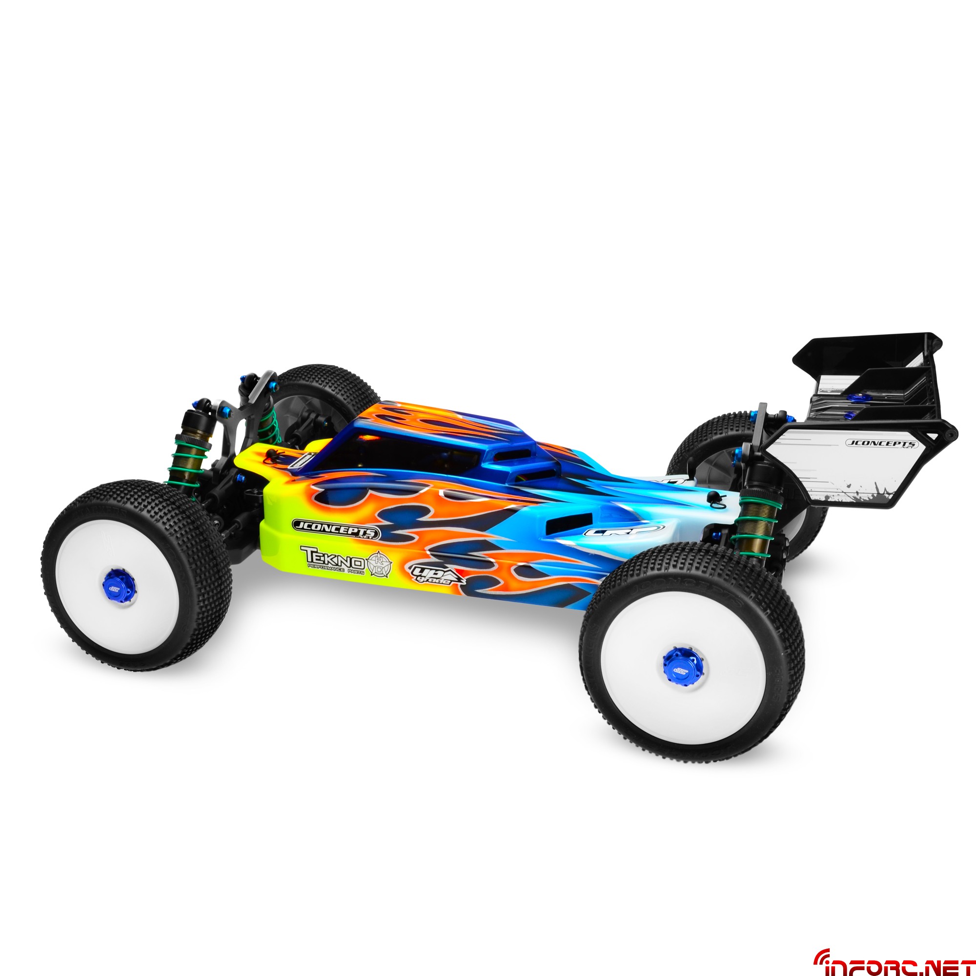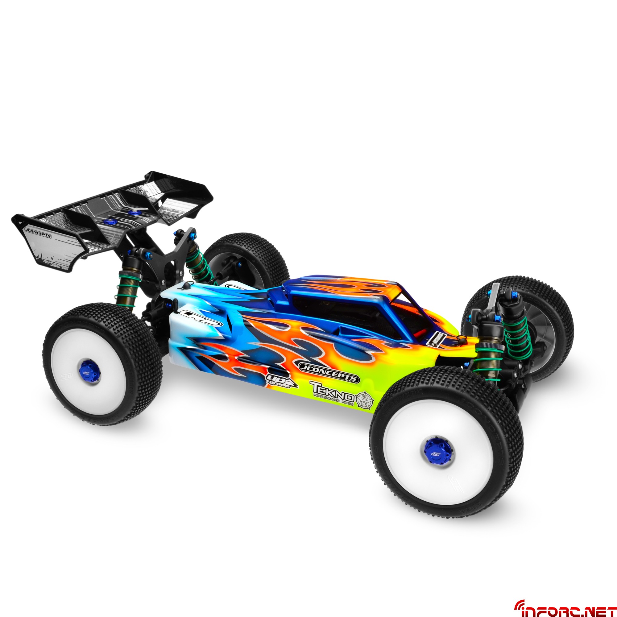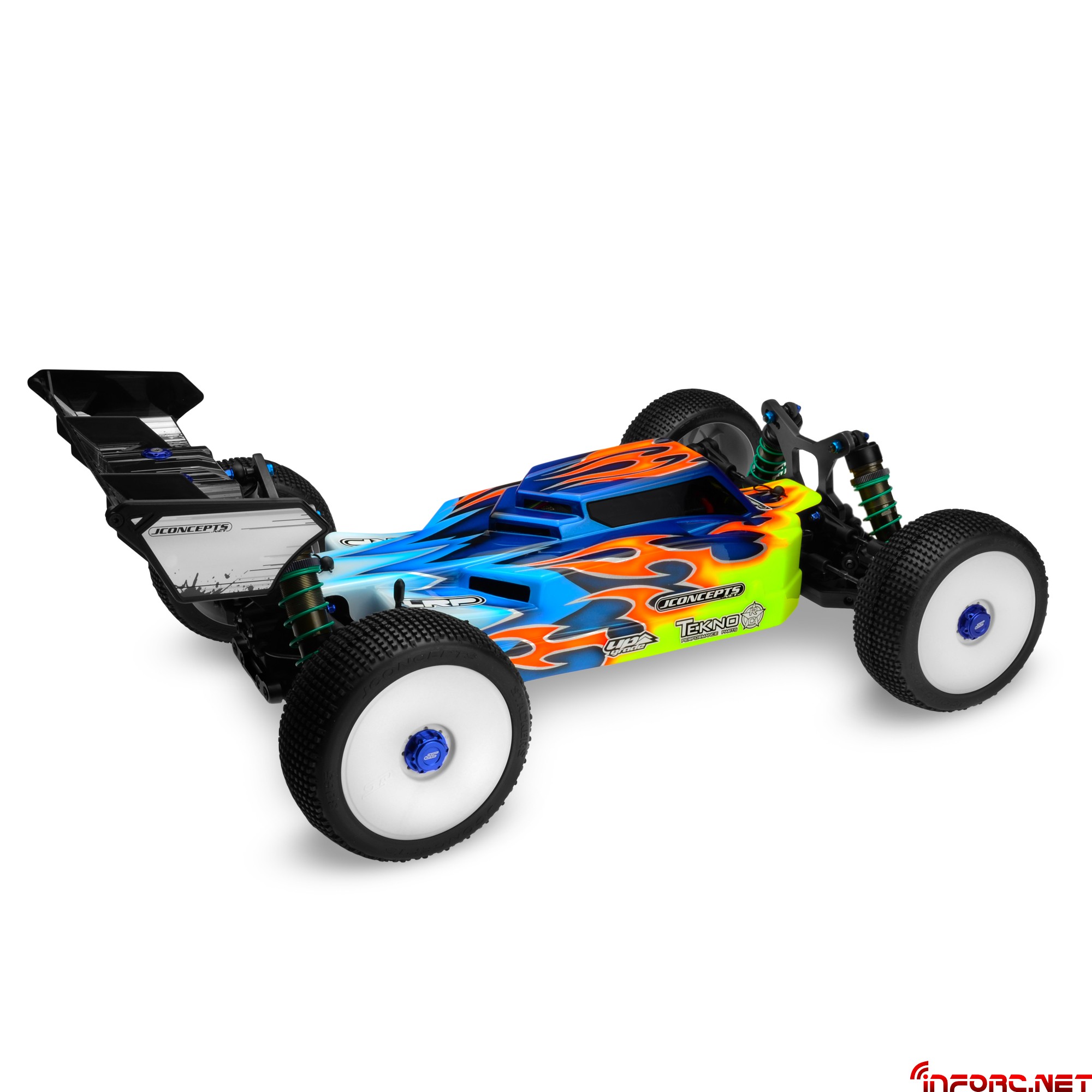 Jconcepts ha decidido hacer más notable la diferencia entre sus gamas Finnisher y Silence (clic aquí para ver) y lo ha conseguido actualizando la primera de ellas para el modelo eléctrico Tekno EB48, de manera que si alguna vez pensamos que no podía existir alguna carrocería de estética más agresiva, con esta se superan. Para ello han seguido la base de la cabina adelantada muy angulada con escalones en su parte posterior, que les ha servido para incorporar hasta seis entradas de aire que aseguran la refrigeración de la electrónica en el interior. Su cola completamente plana y los laterales altos ayudan a mantener la estabilidad en saltos y ante ráfagas de viento.
