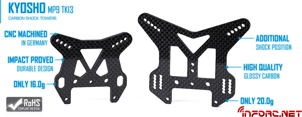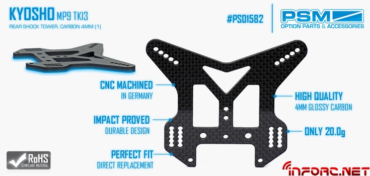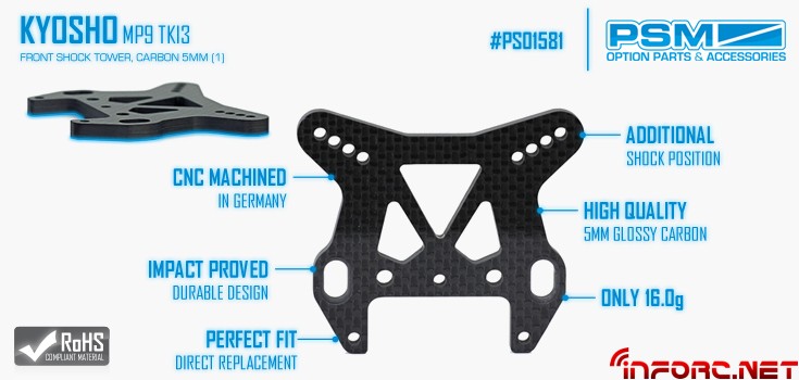 La marca alemana PSM Option Parts & Accessories nos traen un conjunto de mariposas opcionales en fibra de carbono para el Kyosho MP9. Ambas piezas cuya misión es rebajar el peso del modelo, están fabricadas con carbono de alta calidad, con un espesor de 5 milímetros la delantera y 4 milímetros la trasera, con una geometría muy estudiada que promete ser suficientemente flexible para complementar la absorción de los amortiguadores y a la vez ser tan robusta como la original. Además, para incrementar las opciones de configuración, en la mariposa delantera se ha dispuesto un orificio interior adicional que permite inclinar más el amortiguador.