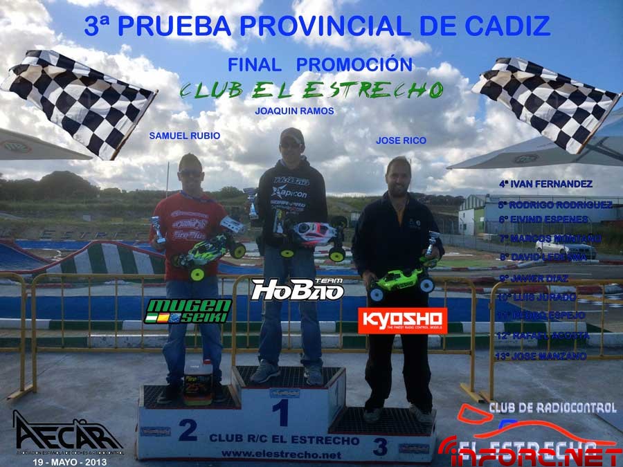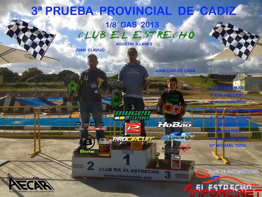 El pasado Domingo 19 de Mayo se celebro la 3ª prueba puntuable para el Campeonato provincial de Cadiz 1/8 Gas 2013, organizado por el Club R/C ” El Estrecho “. El dia amanecio de lujo para disfrutar de una gran jornada de carreras. Las instalaciones estaban de lujo presentando un nuevo aspecto en los boxxes, todo hormigonado semipulido y con un gran compresor. La organización y los recoje coches estubieron a un gran nivel, todo controlado por acreditaciones y teniendo una persona en la puerta para no dejar pasar a nadie que no estuviese acreditada. Con una participación de 42 Pilotos, se decide en la reunión de pilotos, de hacer 4 series, a correr 3 mangas contando las 2 mejores por puntos , 2 cuartos con 13 pilotos, 2 semis y 1 final de 45 minutos. La Pole es conseguida por Agustin Illanes, seguido por Eduardo Puyana y Juan Clavijo. La vuelta rapida la hizo Agustin Illanes en 36,482 bajando la vuelta rapida hasta el momento del circuito en 400 decimas, anteriormente realizada por Bernardo Macias en 36,842.