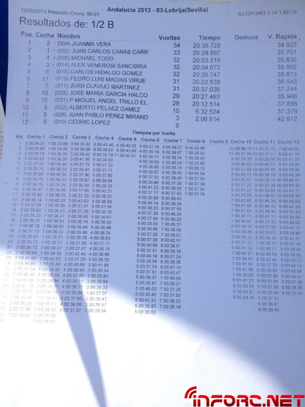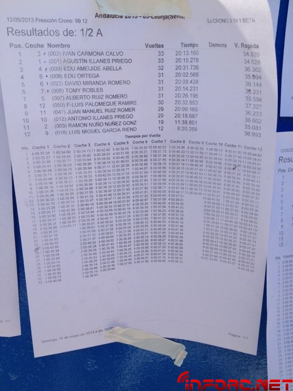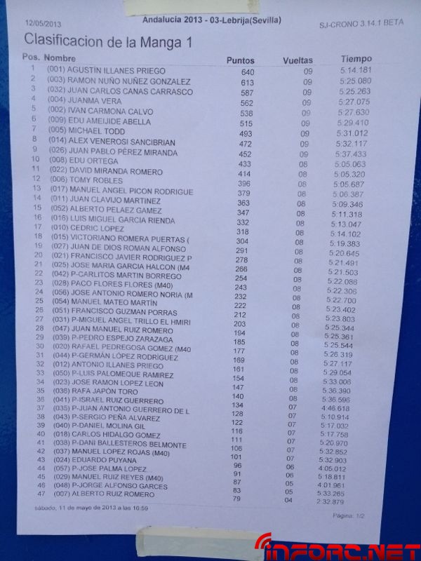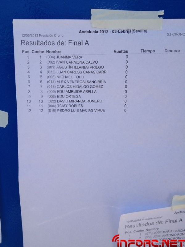 Vamos a recopilar en esta noticia todas las imágenes que hemos subido en relación con el Campeonato de Andalucía 1/8 tt gas 2013 que se ha celebrado este fin de semana en Lebrija. Dejamos en grande la imagen con los resultados de la final y en la galería todas las demás imágenes. Juanma Vera consiguió la victoria seguido por Agustín Illanes en segundo lugar quien, tras dominar las mangas de ayer, ha tenido mala suerte en la final hoy con una parada de motor. En tercer lugar el joven Juan Carlos Canas.