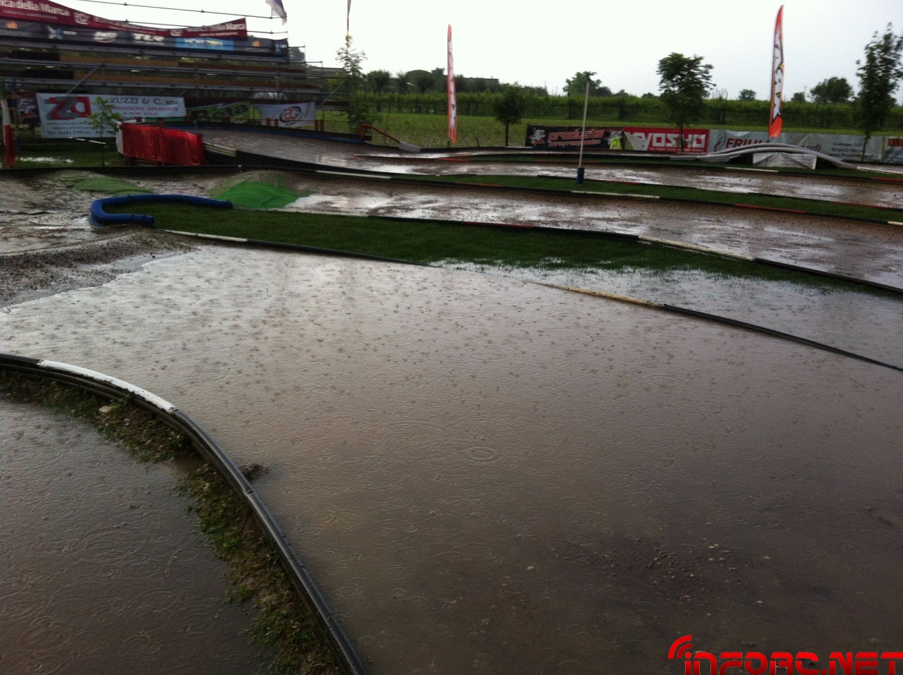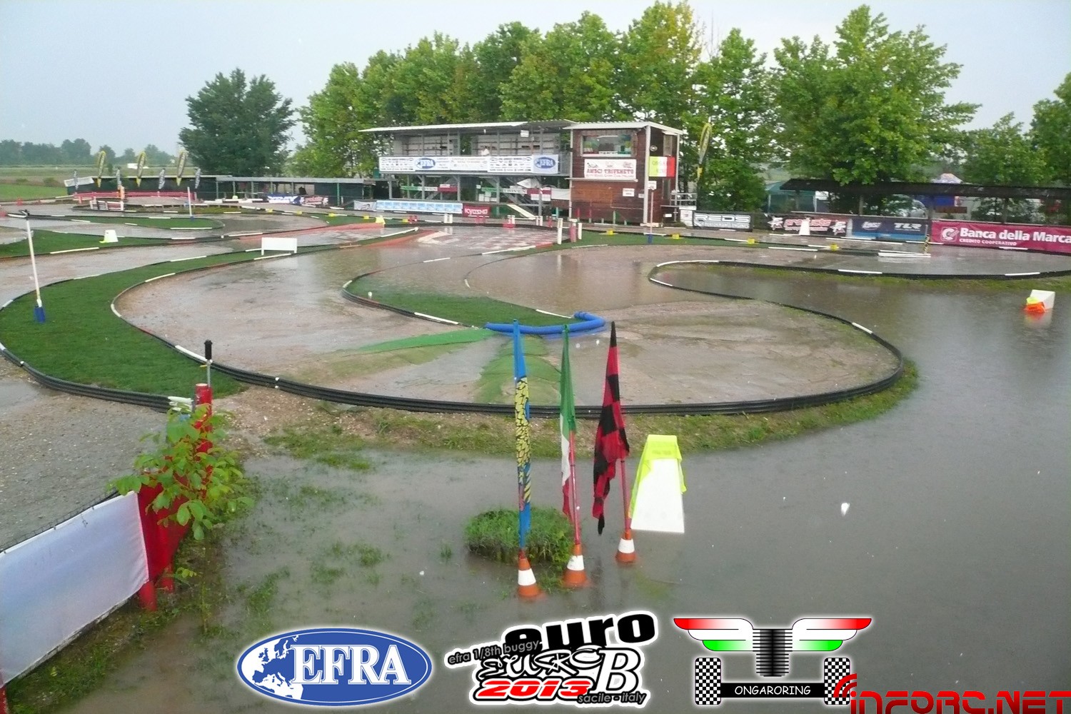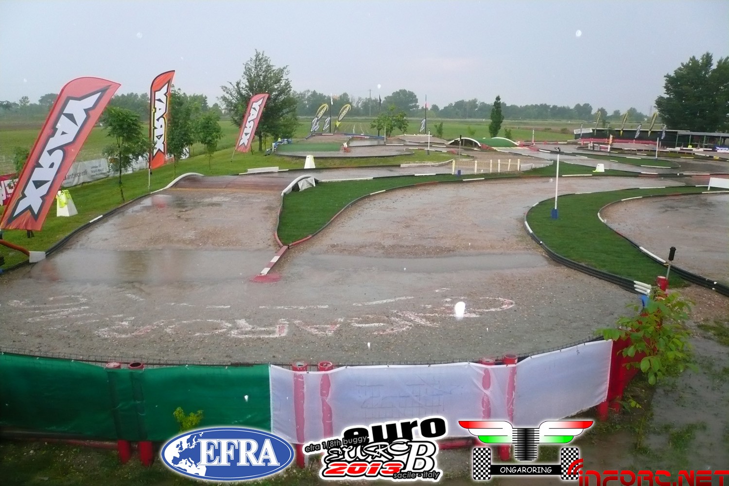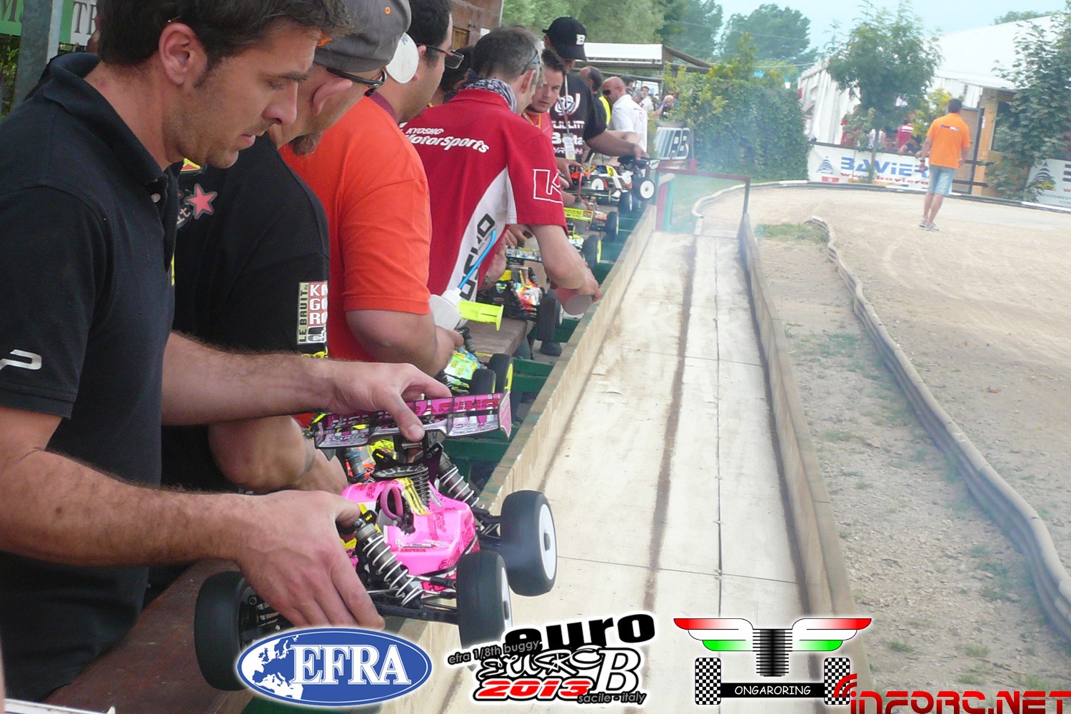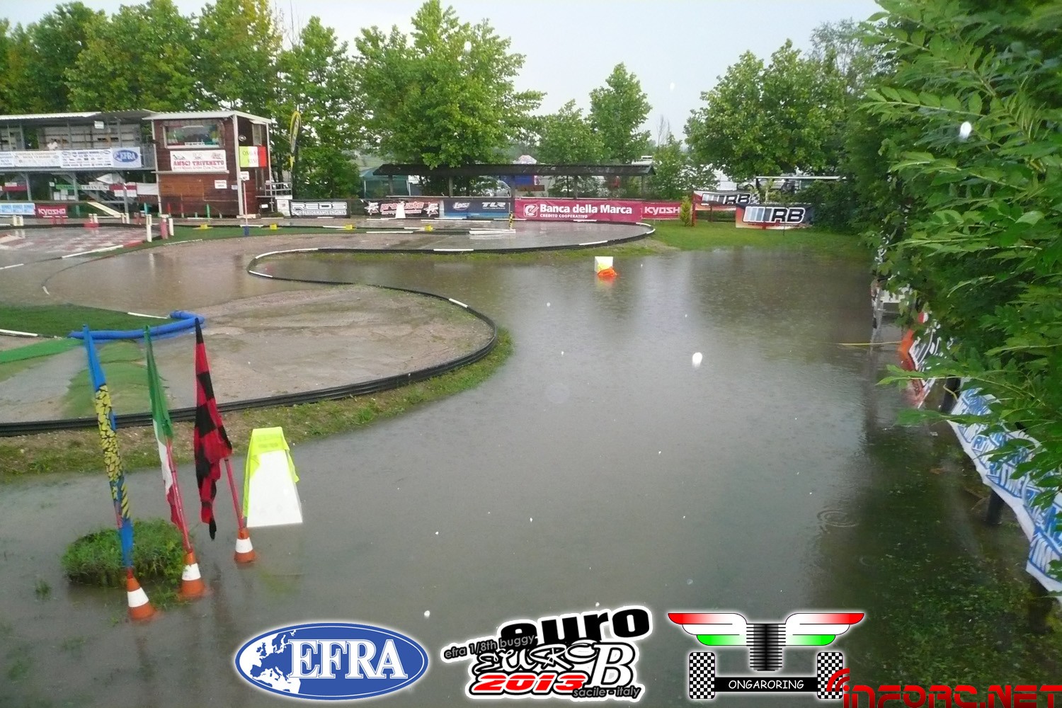 Actualización (Novedades y fotos de Miguel Izquierdo y Neobuggy) 08/06/2013 a las 23:48: En el día de hoy se han disputado solo tres de las cuatro clasificaciones con motivo de las fuertes lluvias que obligó a suspender el resto de la programación. La pole la consigue por tanto el italiano que ayer se llevaba la primera posición en entrenamientos, Davide Ongaro, tras ganar en las dos primeras mangas clasificatorias con su Mugen MBX7. La última manga disputada se la llevó el italiano que ayer empató en puntos con el poleman, Marco Baruffolo, piloto de RB One.