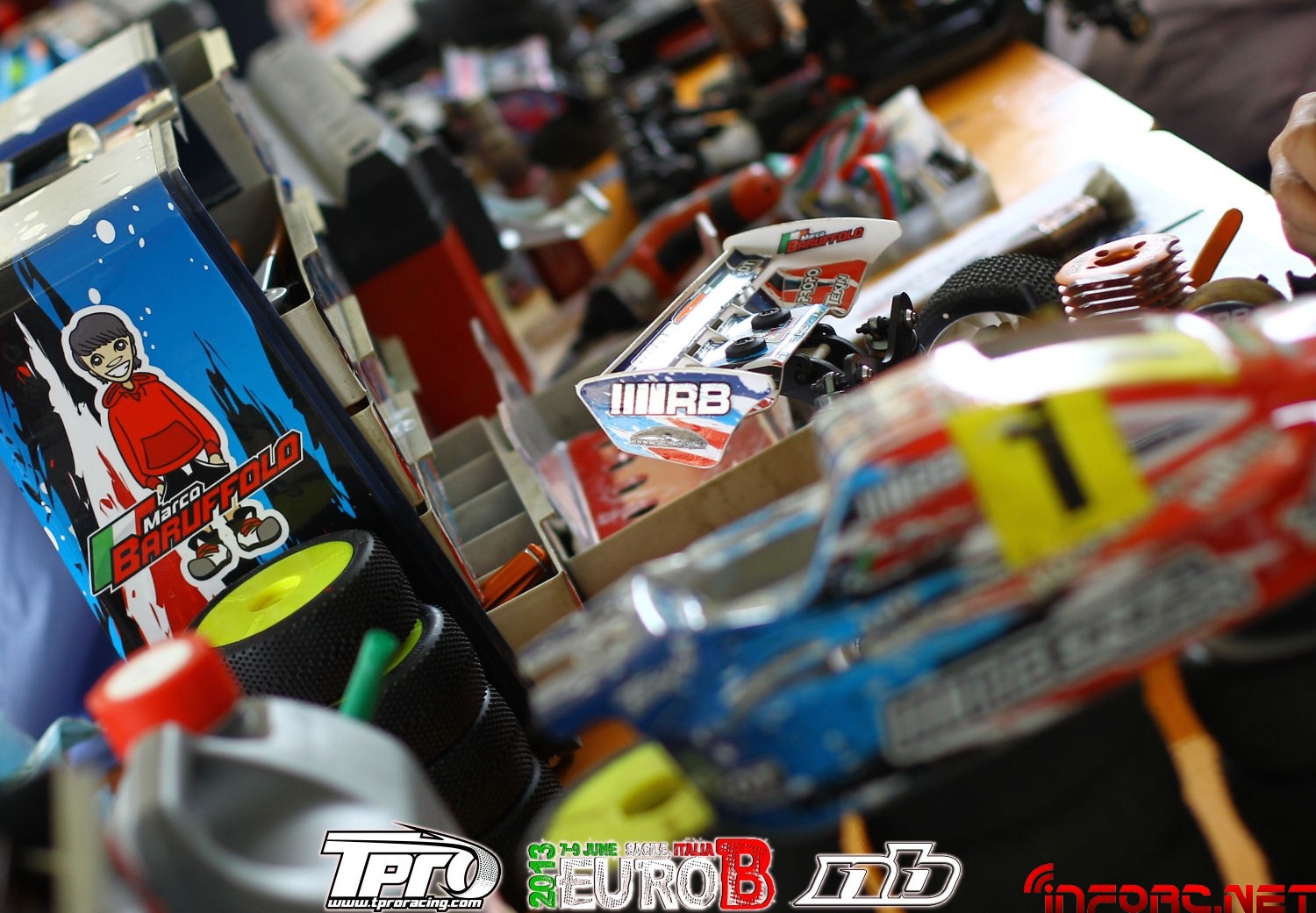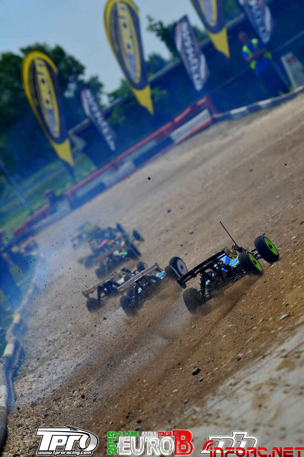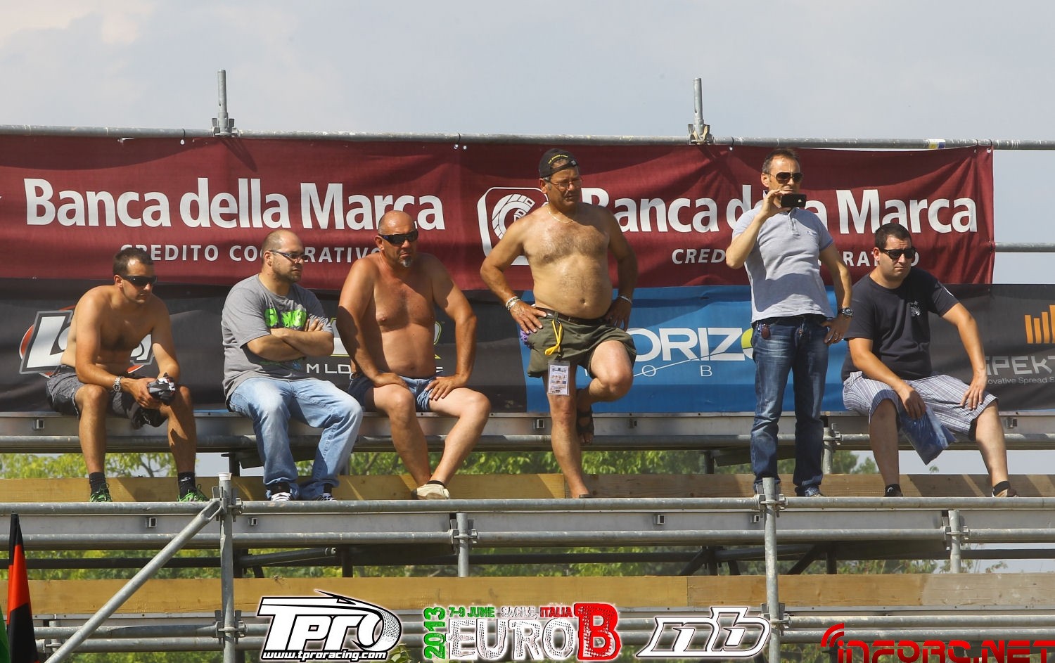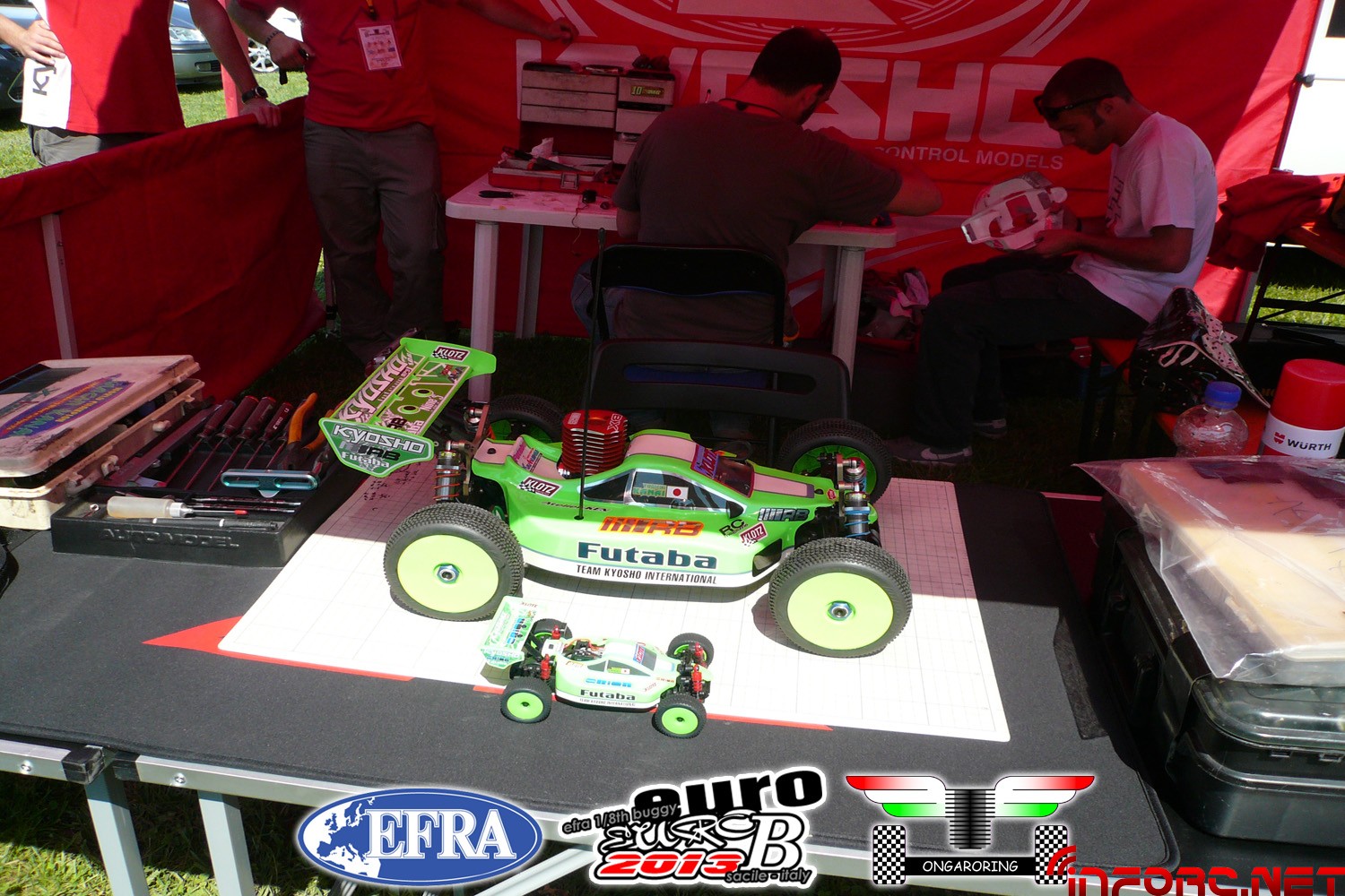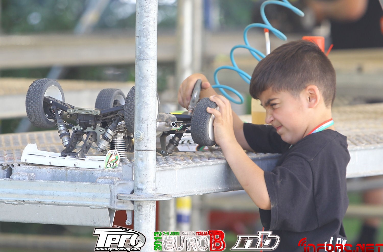 Actualización (Novedades y fotos de Miguel Izquierdo y Neobuggy) 08/06/2013 a las 23:48: En el día de hoy se han disputado solo tres de las cuatro clasificaciones con motivo de las fuertes lluvias que obligó a suspender el resto de la programación. La pole la consigue por tanto el italiano que ayer se llevaba la primera posición en entrenamientos, Davide Ongaro, tras ganar en las dos primeras mangas clasificatorias con su Mugen MBX7. La última manga disputada se la llevó el italiano que ayer empató en puntos con el poleman, Marco Baruffolo, piloto de RB One.