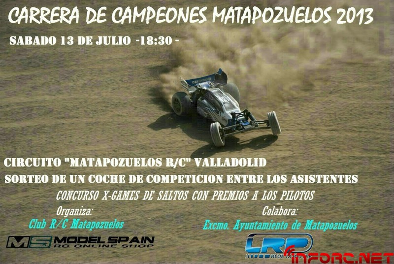 Uno de nuestros patrocinadores, Modelspain, ha organizado para el 13 de Julio junto al Club Matapozuelos R/C de Matapozuelos, Valladolid, un evento que constará de dos partes: Una carrera de campeones (La tercera edición) y un concurso de saltos. Además de todo eso, habrá premios para los mejores saltos, se sorteará un coche entre los asistentes y LRP dará alguna que otra sorpresa. Se contará con servicio de Bar y con nuevas rampas que darán más espectáculo al evento. No tienes escusa para faltar y más sabiendo que ¡la inscripción es gratuita!