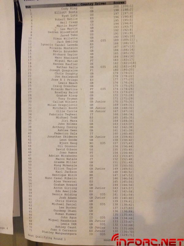 A continuación se siguió con la primera manga de clasificación Nitro y Eléctricos, donde ya volvían al sistema tradicional de clasificar por las vueltas y el menor tiempo obtenido durante los 6 minutos de cada serie. Robert Batlle e Ignacio Candel entrarían en el TOP 16 en la categoría Nitro, además del magnífico puesto de Robert Batlle estrenándose en competición en la modalidad 1/8TT Eléctrica. A continuación dejamos los resultados del TOP 16 y de los asistentes desde España en Nitro: