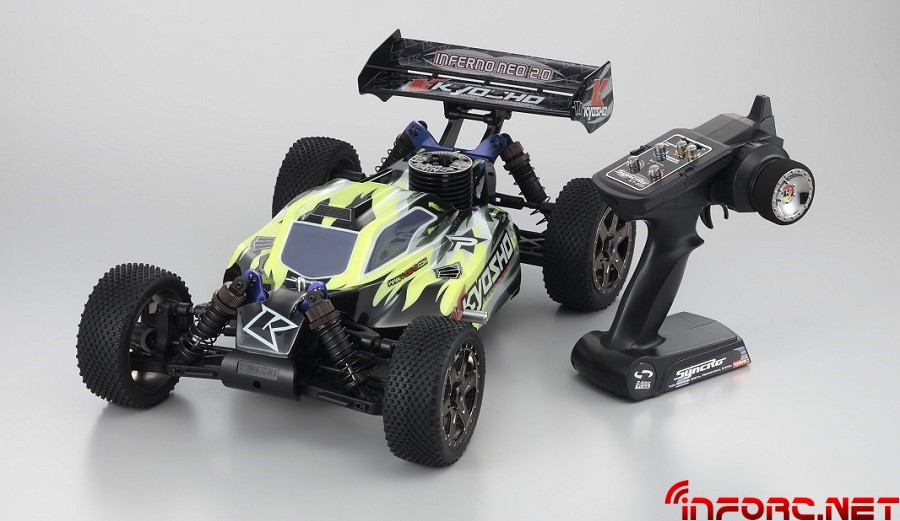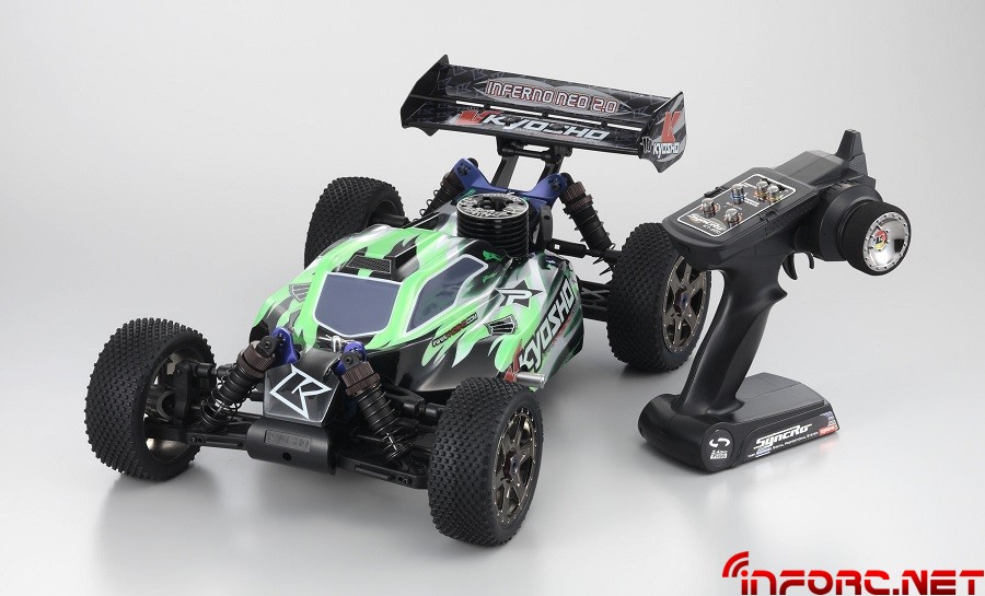 El Kyosho Inferno NEO 2.0 es la última versión del Inferno NEO. Se distingue de la versión precedente por la aparición de un nuevo motor, el KE21. El KE21 un motor de última generación con tirador de diámetro pequeño que permite utilizar las placas del motor y el embrague tradicional de los motores sin tirador. El KE21 está equipado con una línea de escape con codo clásico, sujeto por un resorte y una junta tórica. Este NEO 2.0 lleva un equipo de alta gama compuesto por amortiguadores Big Bore, tirantes a paso inverso, nuevas llantas que montan neumáticos de alto agarre y una carrocería inspirada en los modelos utilizados en competición. Además, las piezas en aluminio tendrán nuevos colores que le darán un toque distinto a lo visto hasta ahora. El Inferno NEO 2.0 lleva un equipo de radio en 2,4Ghz, con la emisora KT200 con pantalla y su receptor KR200. Lo único que es necesario para empezar a rodar y no incluye el kit: el combustible, ocho pilas tipo AA (R6) para la emisora y el receptor, y el chispómetro para calentar las bujías.
