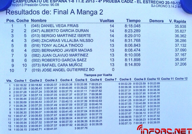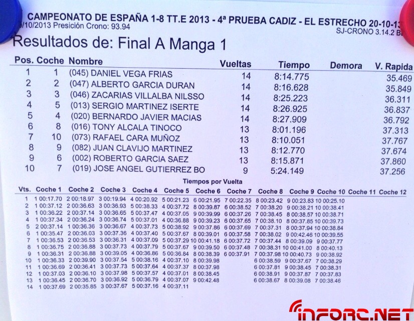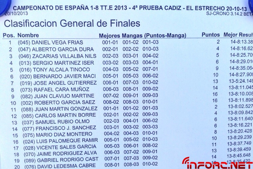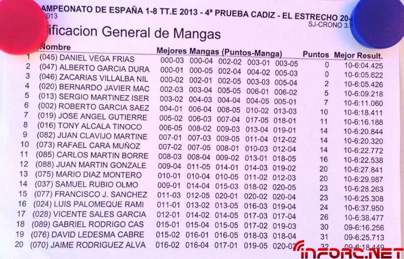 A continuación os dejamos el resultado de la general de mangas y el orden de salida en las finales del Campeonato de España 1/8 tt-e que se está disputando actualmente en el Club El Estrecho, San Roque.