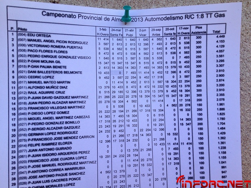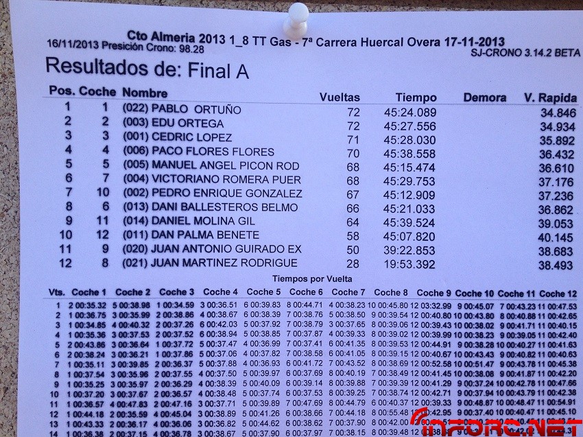 La carrera tuvo lugar en el circuito Huercal Overa, chapó al Club por el regalo que hicieron a todos los participantes (Una camiseta con un croquis de todos los circuitos del provincial). En esta prueba se daban cita alguno de los pilotos punteros del open de murcia. La pole la consiguió Pablo Ortuño, 2º Edu Ortega y 3º Paco Flores en la general de mangas. La final resultó estar muy reñida hasta la ultima vuelta, resultando haber una diferencia entre los dos primeros de 3,5 segundos después de los 45 minutos