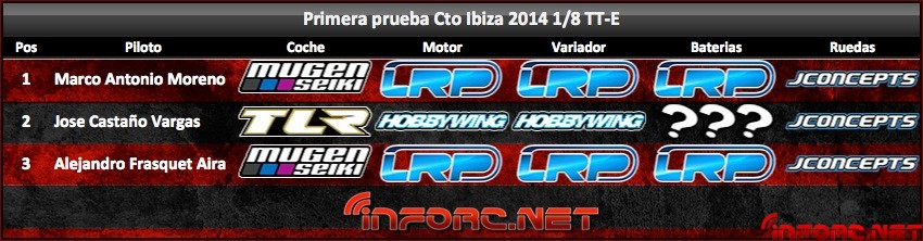 Cada vez sois más los que os animáis a enviarnos información y resultados de las carreras a las que asistís y en esta ocasión, Marco Antonio Moreno nos envía info con los resultados de la primera prueba del Cto de Ibiza 1/8 TT gasolina y eléctrico 2014. Marco nos comenta: