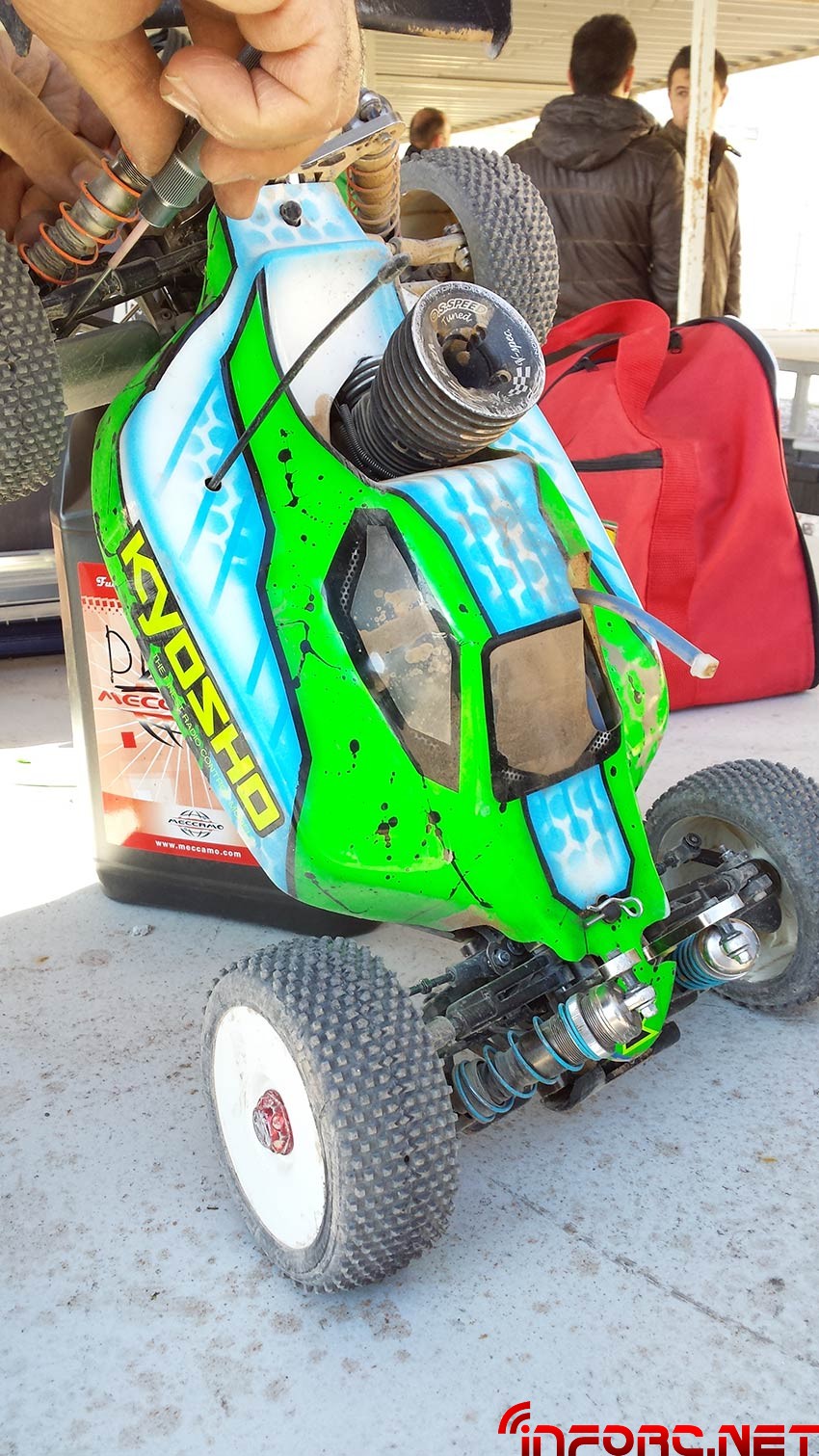 A las 09:30 cierre de inscripciones y reunión de pilotos, en la que se decide dada la escasa participación hacer dos mangas clasificatorias de 5 minutos divididas en dos series, dos semifinales A y B a 10 minutos, y una Final a 45 minutos. Para esta carrera opté por montar el motor de repuesto, un RB b11 con muchos litros a sus espaldas y reservar el recién estrenado Ultimate M8 para otras citas, al igual que el otro piloto aragonés Diego que acostumbra a montar un Alpha A852 para montorizar su Kyosho, tomó la decisión de usar un Os speed también con muchos litros consumidos.