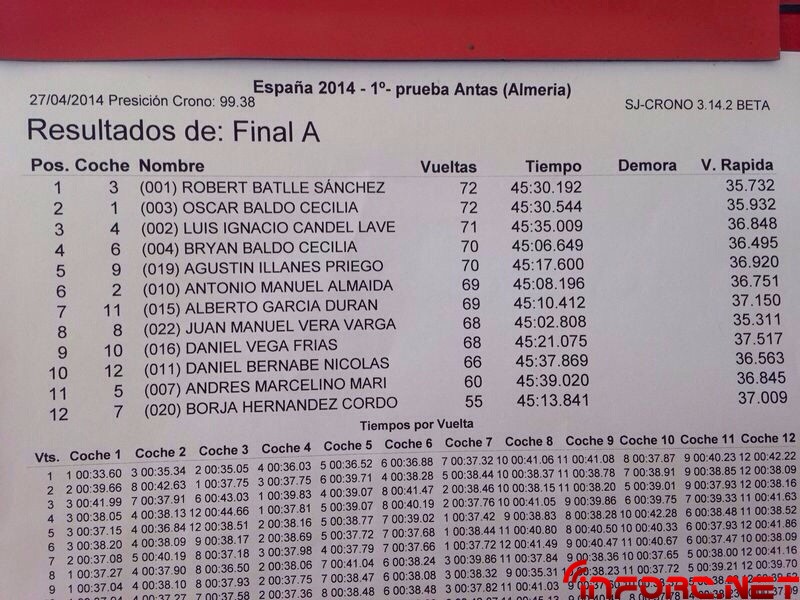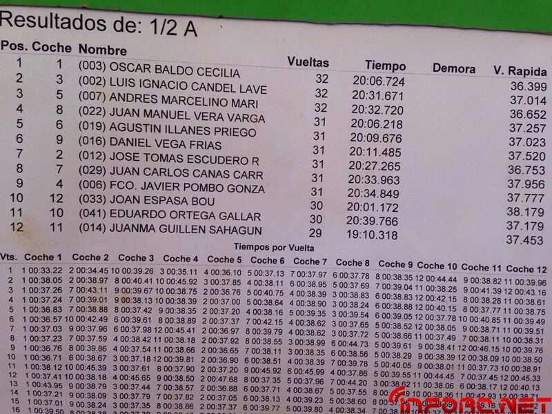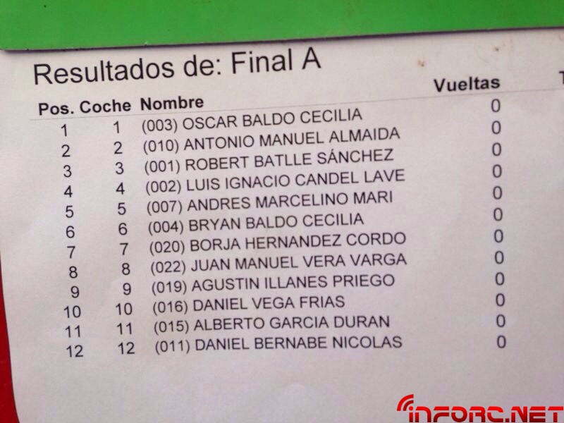 ACTUALIZADO A LAS 17:12 – Final de infarto en la que Oscar Baldó ha dominado hasta la última vuelta en la que Robert Batlle lo ha alcanzado tras remontar desde el último lugar y estando a 15 segundos de ser doblado por Oscar, debido a una parada de motor a la salida de boxes. IMPRESIONANTE. En tercer lugar ha finalizado Ignacio Candel. No os perdáis mañana el vídeo y la galería de fotos y recordad compartir.