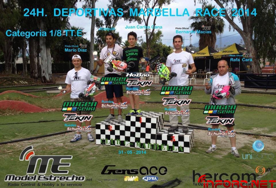 Este fin de semana ha tenido lugar en Marbella la carrera de coches radiocontrol celebrada durante las 24 horas deportivas con las modalidades de 1/8 TT eléctrico y 1/10 2WD. En ambas se ha alzado con la pole en mangas y victoria en la final el joven Juan Carlos Canas, seguido de Joaquin Ramos y Juan Díaz en 1/10 y de Joquín Ramos y Bernardo Macías en 1/8. Esto comentaba el padre del joven piloto malagueño en las redes sociales: