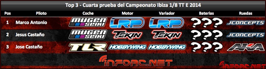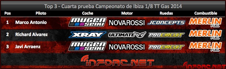 <p class="p1">Marco Antonio nos envía desde Ibiza el top 3 de las dos categorías disputadas en la cuarta prueba del Campeonato de Ibiza 1/8 TT gas y eléctrico. Recuerda que puedes mandarnos tus crónicas, fotos y vídeos a<strong> noticias@inforc.net</strong></p> <p class="p1"><img class="aligncenter size-full wp-image-28613" src="http://www.inforc.net/wp-content/uploads/2014/06/20140601_144326.jpg" alt="20140601_144326" width="850" height="478" /></p> [gallery ids="28614,28615,28612"]