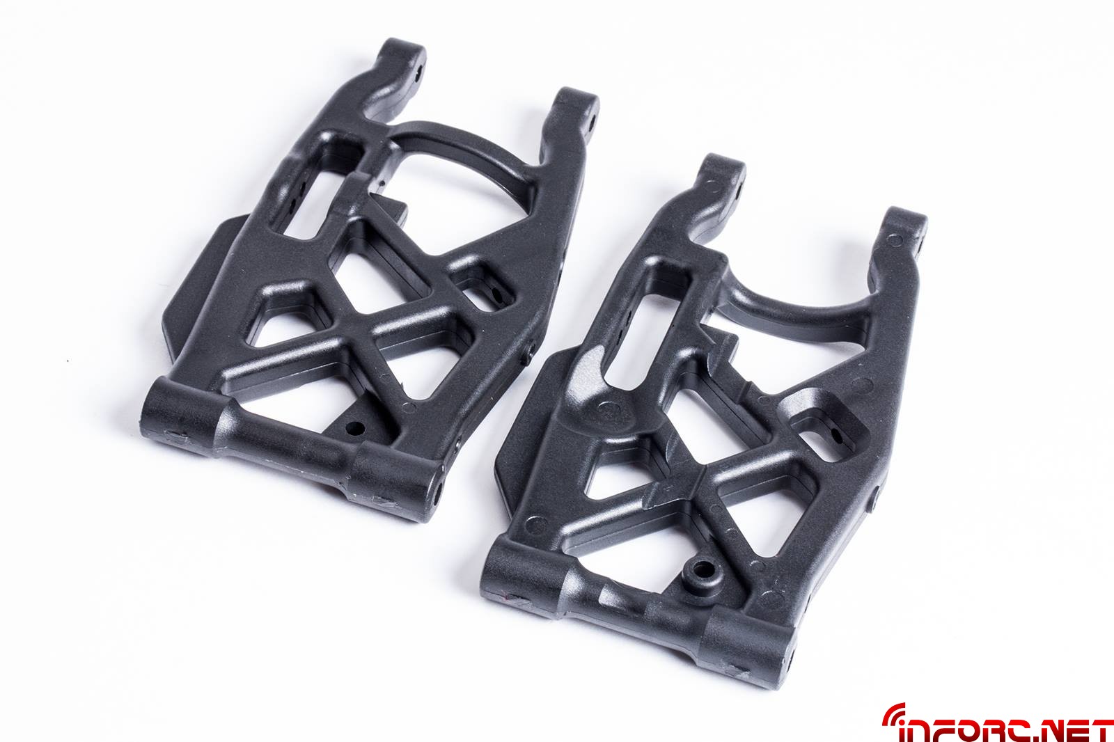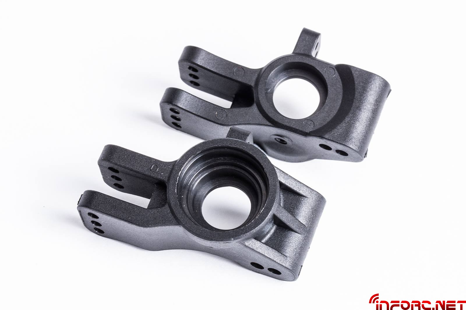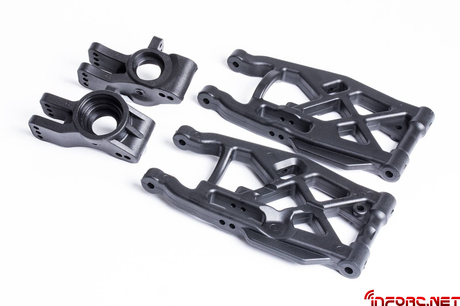 También se ha rediseñado la posición de las manguetas delanteras, mejorando la dirección del coche en combinación con la nueva placa de ackerman con orificios de anclaje adicionales que permitirán más opciones de ajuste. El trapecio superior delantero ha sido acortado 1.6mm para permitir más ajustes de caída y poder usar la arandela E0161 entre la bola y el trapecio.