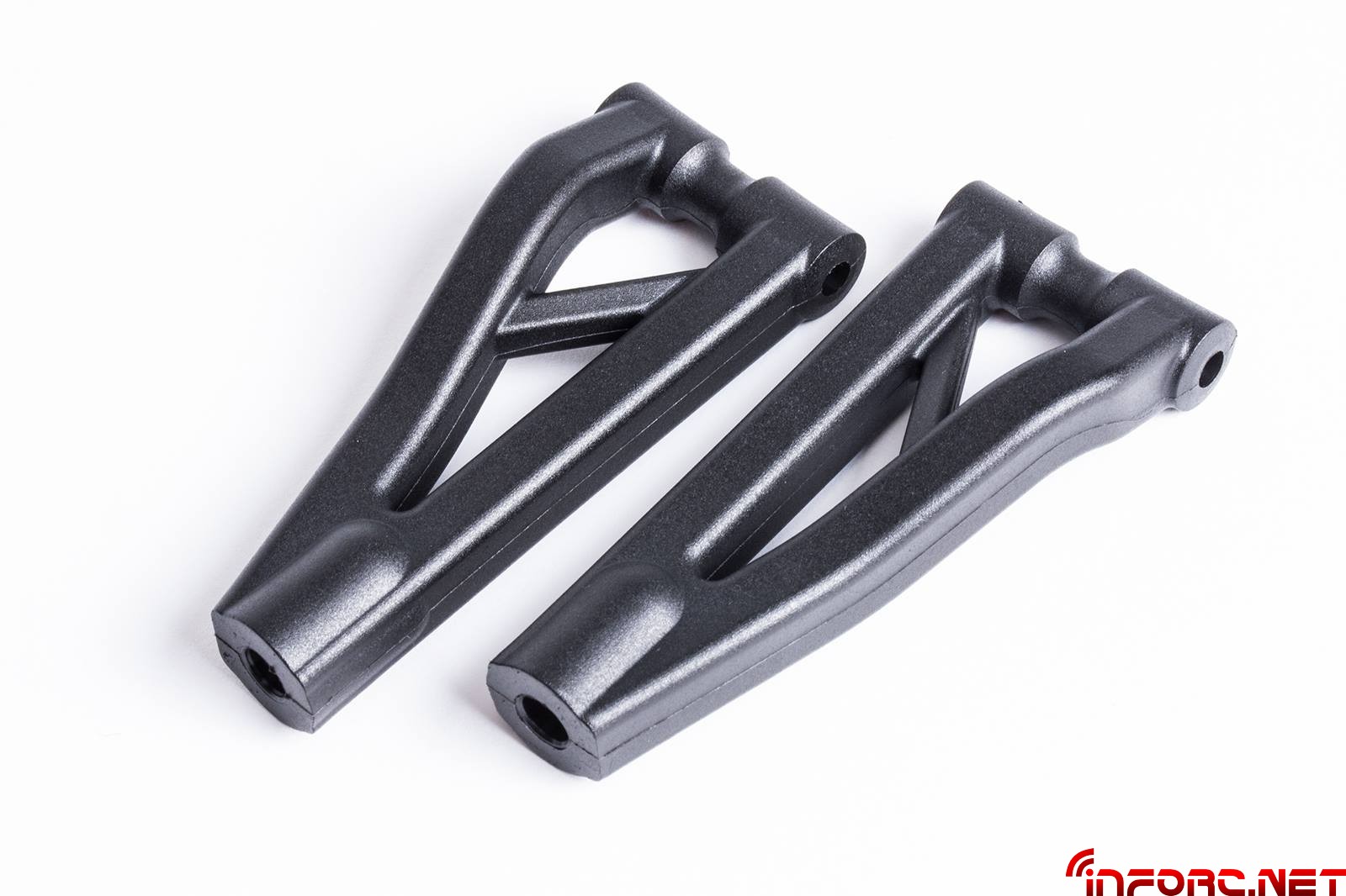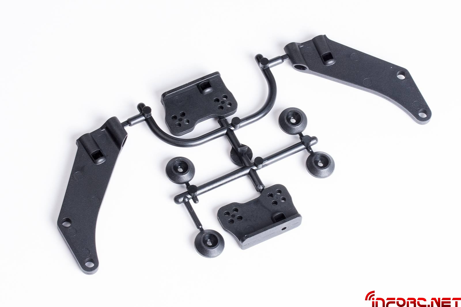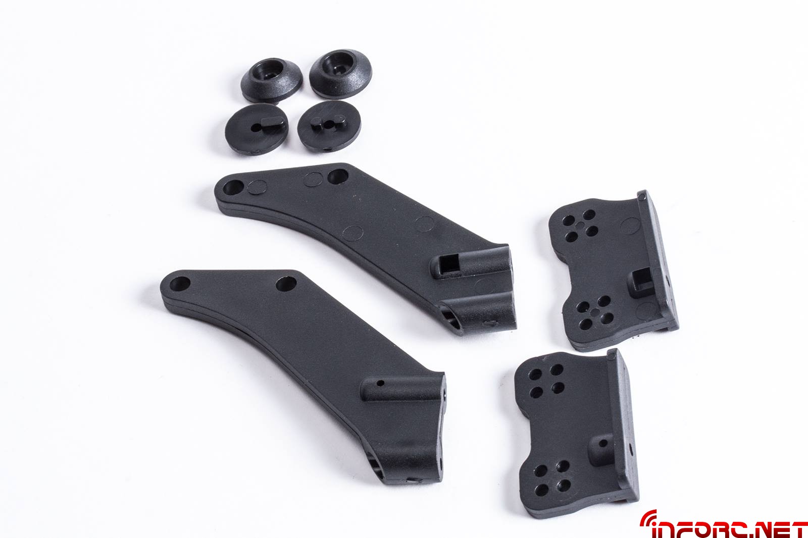 También se ha rediseñado la posición de las manguetas delanteras, mejorando la dirección del coche en combinación con la nueva placa de ackerman con orificios de anclaje adicionales que permitirán más opciones de ajuste. El trapecio superior delantero ha sido acortado 1.6mm para permitir más ajustes de caída y poder usar la arandela E0161 entre la bola y el trapecio.