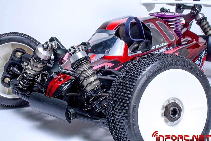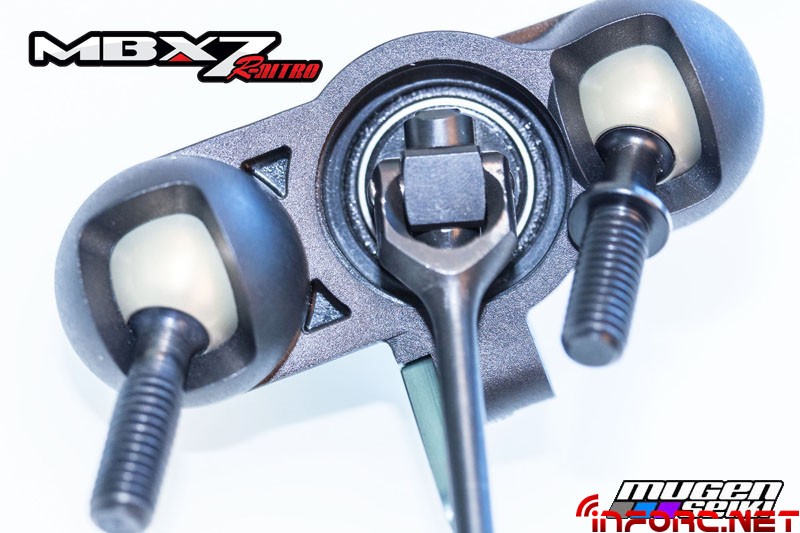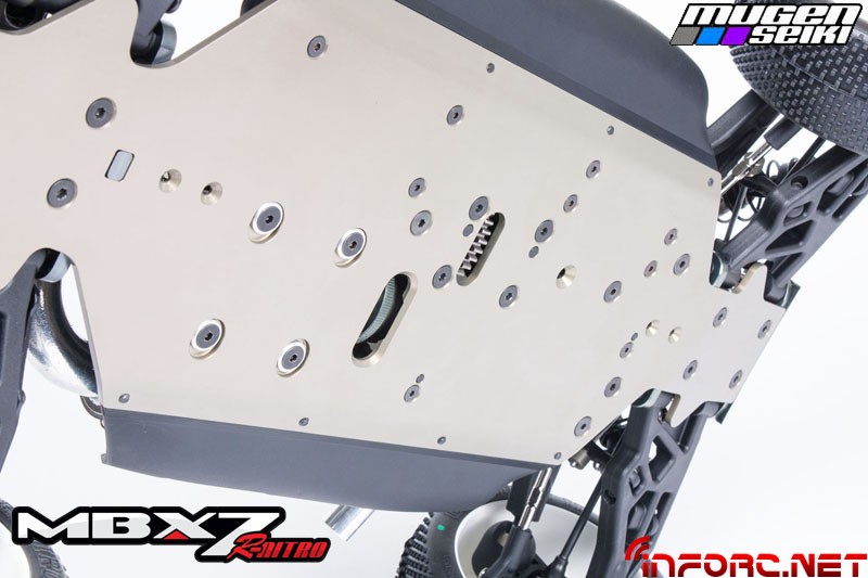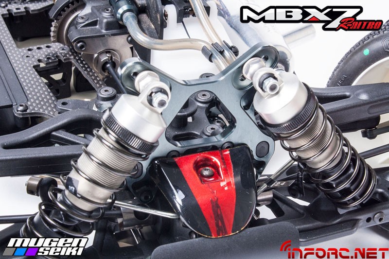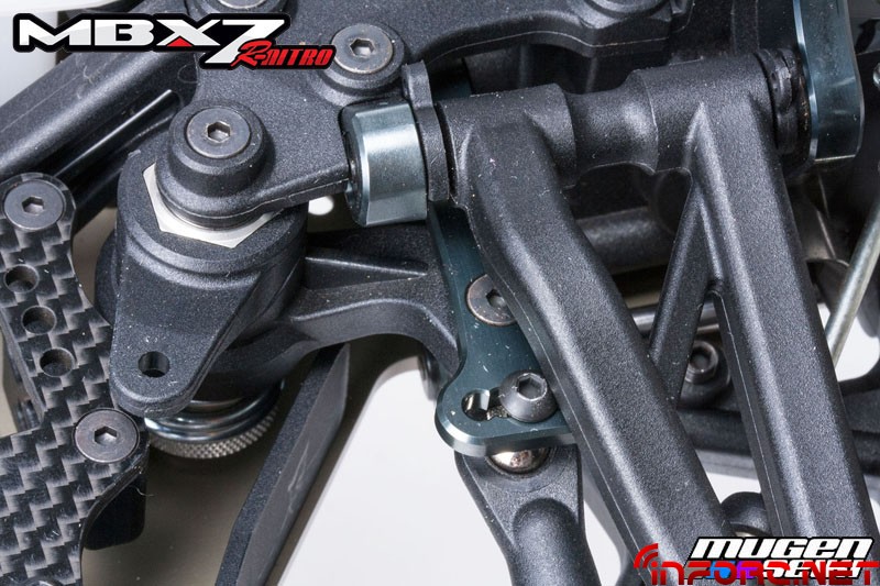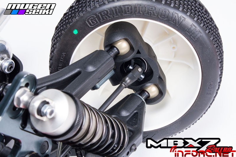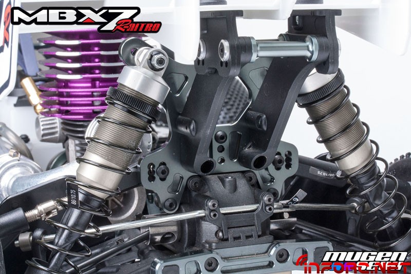 Mugen se ha concentrado en mejorar aún más la suspensión del MBX7R, con nuevos amortiguadores de 16mm que mejorarán la estabilidad notablemente tanto en saltos como en baches, además de disminuir el desgaste de las siliconas en su interior. Además, los traseros son 4mm más cortos y en unión con la nueva mariposa trasera, mantendrán al MBX7R pegado al suelo. En cuanto al chasis, el pliegue lateral ha cambiado su ángulo, aumentando la rigidez y mejorando las sensaciones en todos los terrenos.