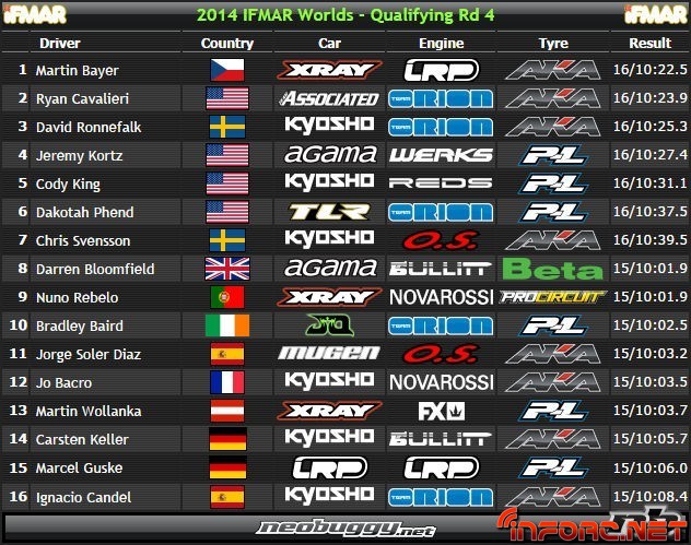 Las Q3 y Q4 de ayer en el mundial fueron una sorpresa para muchos ya que la influencia de la lluvia en el circuito generó un gran baile de posiciones entre pilotos, bajando a unos y subiendo a otros. Uno de los beneficiados de esta situación fue uno de nuestros representantes nacionales, Ignacio Candel, quien consiguió meterse en el top 16 de la Q4 con su Kyosho MP9 motorizado con RB…¿o no? Cuando echamos un ojo a la tabla de clasificaciones con las marcas de cada piloto, nos sorprendió apreciar que en la marca de motor de Candel, habían puesto Orion, en lugar de RB, su actual sponsor.