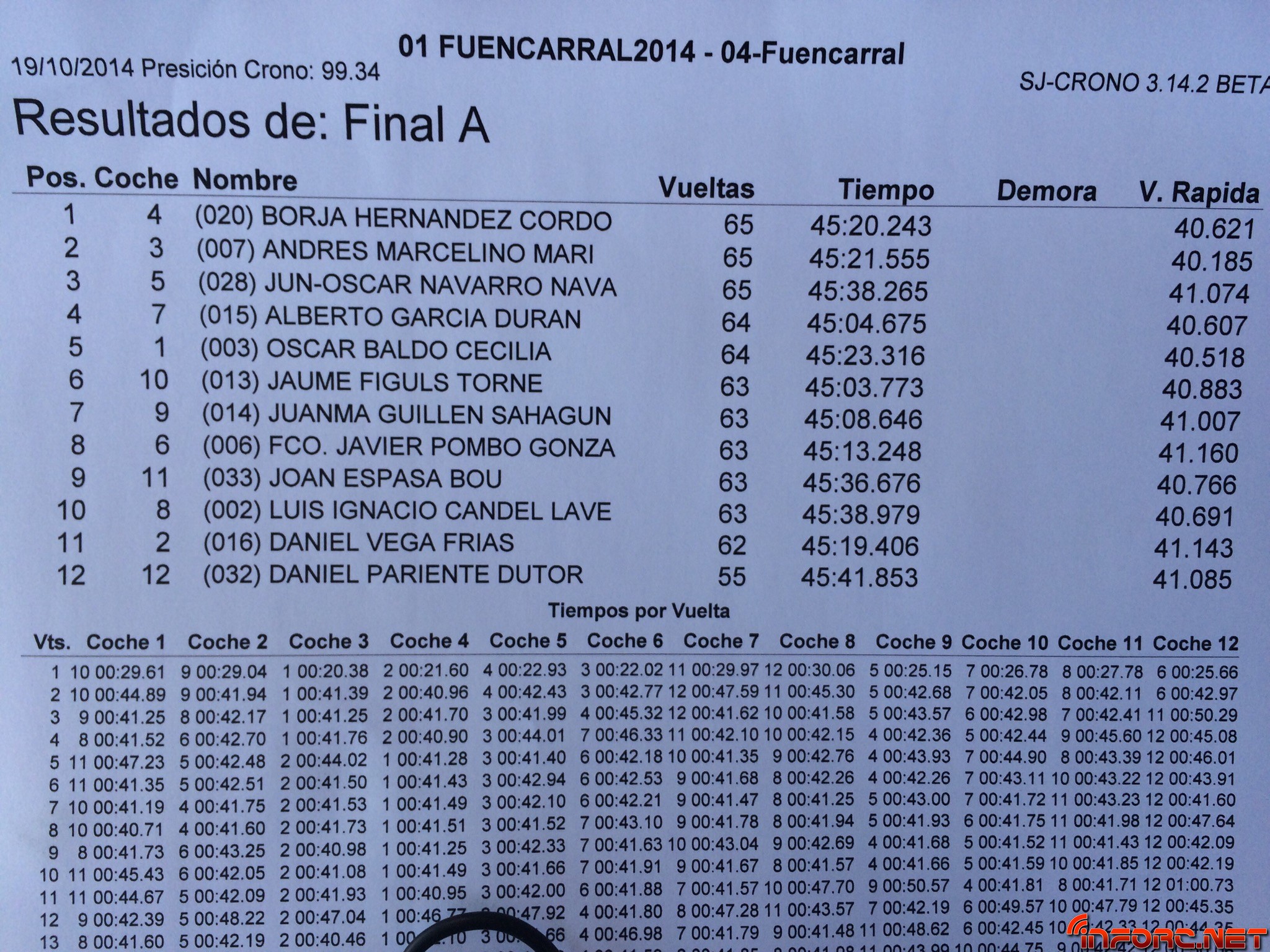 Tras una final de 45 minutos en la que todas las posiciones desde la cuarta han estado disputados hasta los últimos 15 minutos de carrera, ha sido Borja Hernández quien ha conseguido la primera posición, seguido de Andrés Marcelino, único piloto capaz de seguirle el ritmo y con quien ha tenido muchas luchas durante toda la final intercambiando posiciones. En tercer lugar ha permanecido inamovible Oscar Navarro desde que comenzó la final, con buen ritmo para separarse del grupo, pero insuficiente para alcanzar a Borja y Marcelino. Vega, García, Pombo, Guillén y Candel, han protagonizado unas bonitas luchas del 4º al 8º puesto, con múltiples intercambios de posiciones.