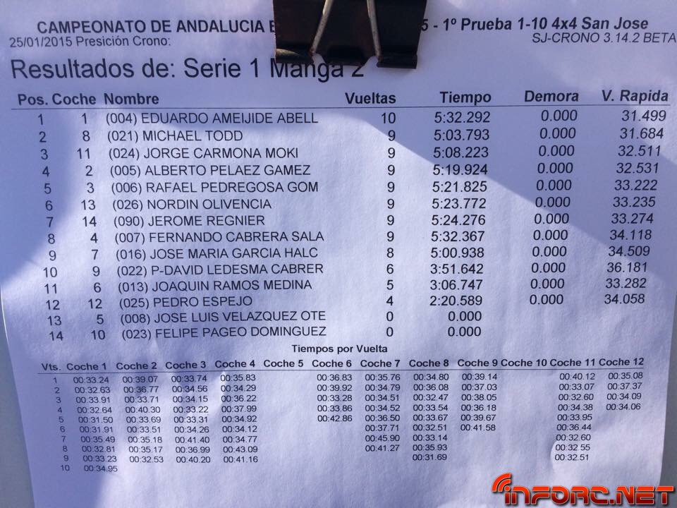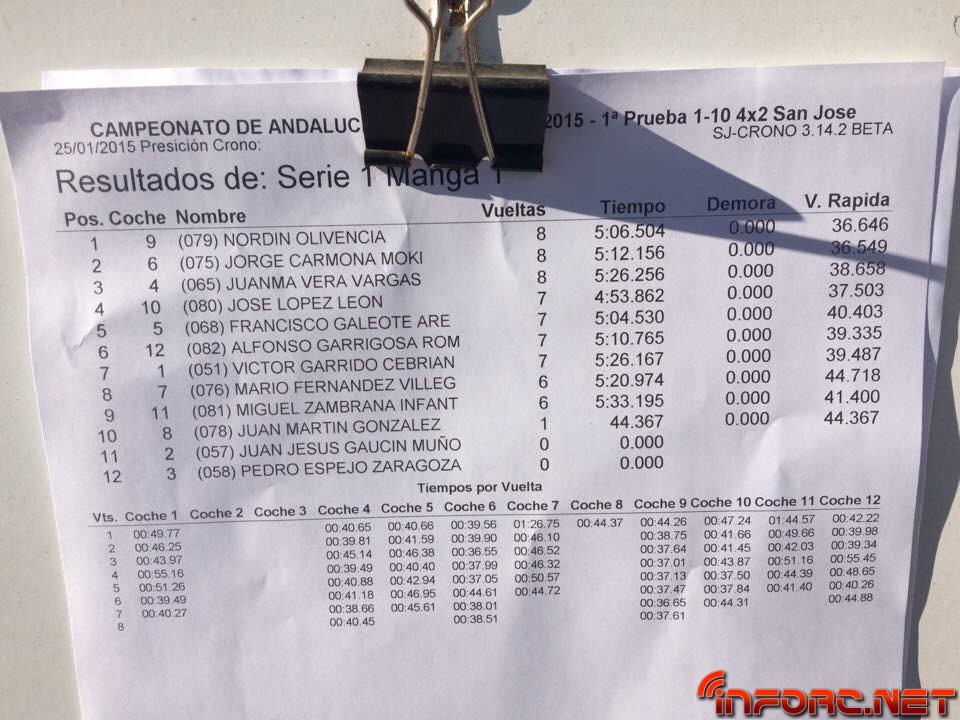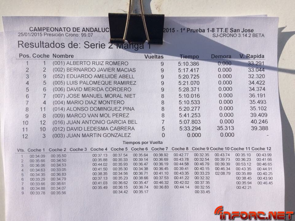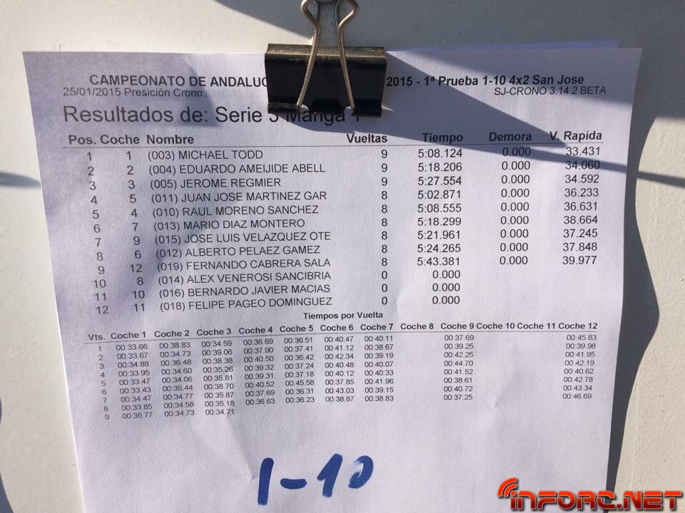ACTUALIZADO A LAS 19:00 – Acaba de finalizar el día de entrenos libres y cronometrados en San José de la Rinconada y todos los pilotos están encantados con las estupendas sensaciones que les transmite este circuito de moqueta, sobre todo a los usuarios de 2WD que están viendo como sus tiempos no distan demasiado de los tiempos de 4WD e incluso de los de 1/8 TT. Al final de la tarde, los más rápidos de cada categoría, ordenados por vuelta más rápida de la última tanda, han sido: