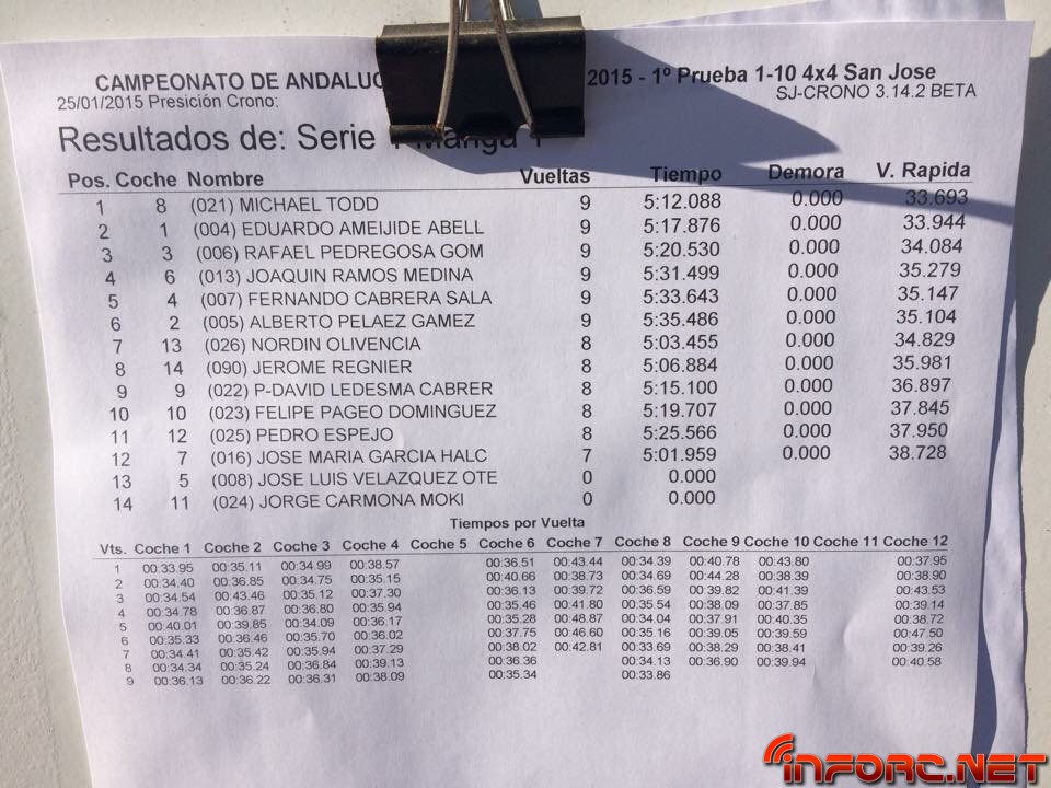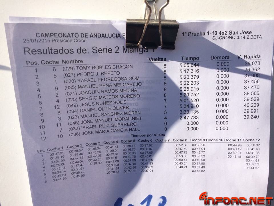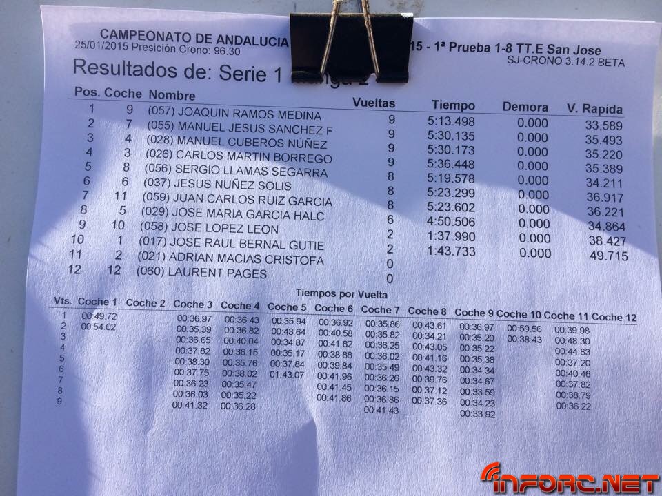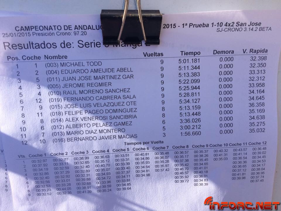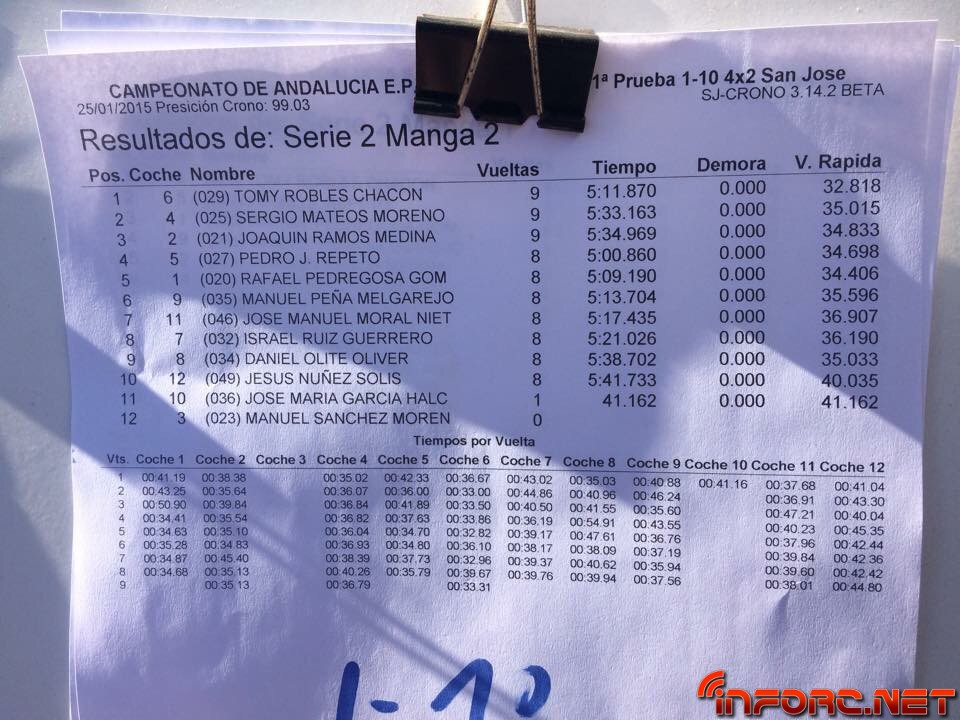 ACTUALIZADO A LAS 19:00 – Acaba de finalizar el día de entrenos libres y cronometrados en San José de la Rinconada y todos los pilotos están encantados con las estupendas sensaciones que les transmite este circuito de moqueta, sobre todo a los usuarios de 2WD que están viendo como sus tiempos no distan demasiado de los tiempos de 4WD e incluso de los de 1/8 TT. Al final de la tarde, los más rápidos de cada categoría, ordenados por vuelta más rápida de la última tanda, han sido: