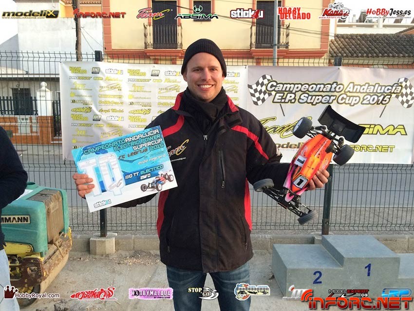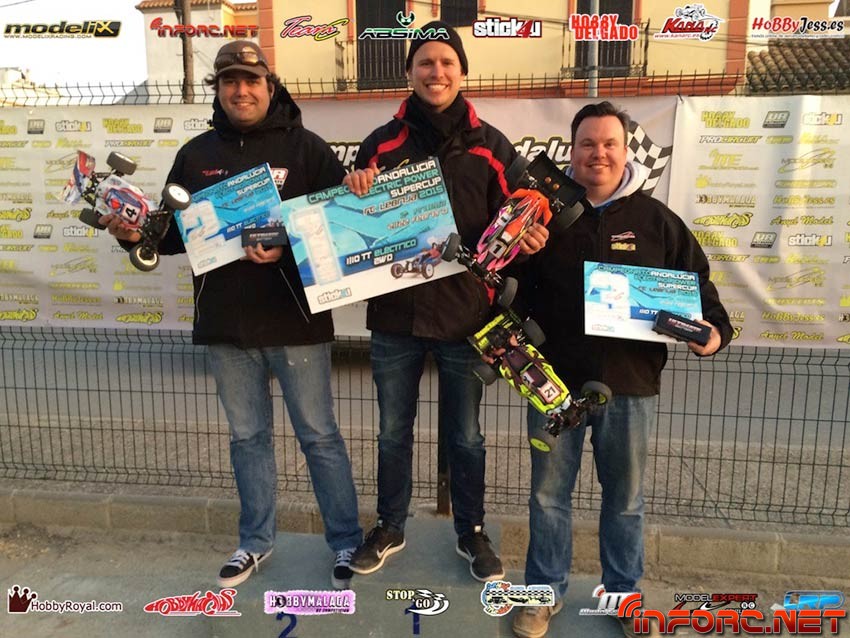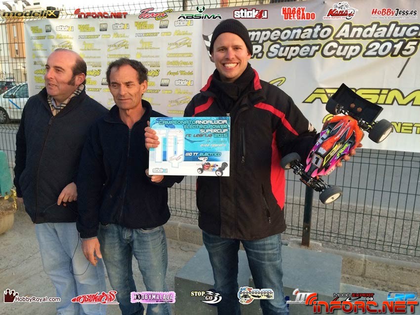 Ayer tuvo lugar en Lebrija la segunda prueba de la EP Supercup 2015, campeonato en el que compiten las categorías de 1/8 TT-E, 1/10 2WD y 1/10 4WD. La concienzuda preparación del trazado por parte del club organizador, permitió que, a pesar de las lluvias que encharcaron el sábado el circuito, este estuviese practicable y en perfectas condiciones esa misma tarde, permitiendo unas tandas de entrenos gracias a la iluminación nocturna del circuito.