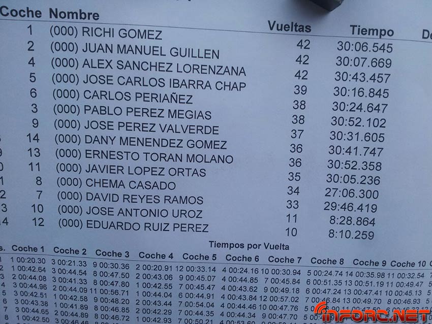 El equipo de Richi reposta una vuelta antes que Guillen y en ese momento tiene un vuelco lo que le da ha Richi la primera posición que pierde vueltas después en un golpe. Richi persigue incansable a Guillen y en el siguiente repostaje sale por delante y en ese momento Richi y su Intech ya no perderán la posición haciendo una carrera inteligente con la calculadora em la mano regulando los tiempos y esfuerzos. De este modo Richi se quita la espina que le dejo su retorno semanas antes en el regional. Todo apunta a que poco a poco va recuperando sensaciones y evolucionando un coche con un gran potencial.