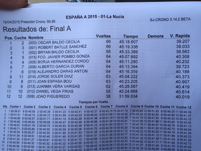 Tras un magnífico fin de semana de carreras en las estupendas instalaciones del club de radiocontrol La Nucía, ha sido Oscar Baldó el piloto que, tras los 45 minutos de final, se ha alzado como vencedor de esta primera prueba del Nacional A 2015. Se trata de una victoria muy importante para el joven piloto de Redován ya que en los 9 años que Robert lleva ocupando el título nacional, solo había dejado de ganar dos pruebas, una en Valladolid por rotura y otra en Orihuela por problemas de motor.