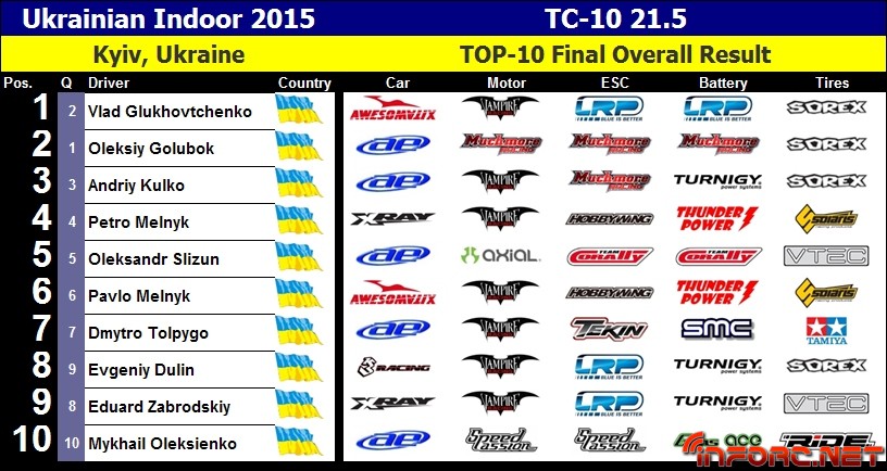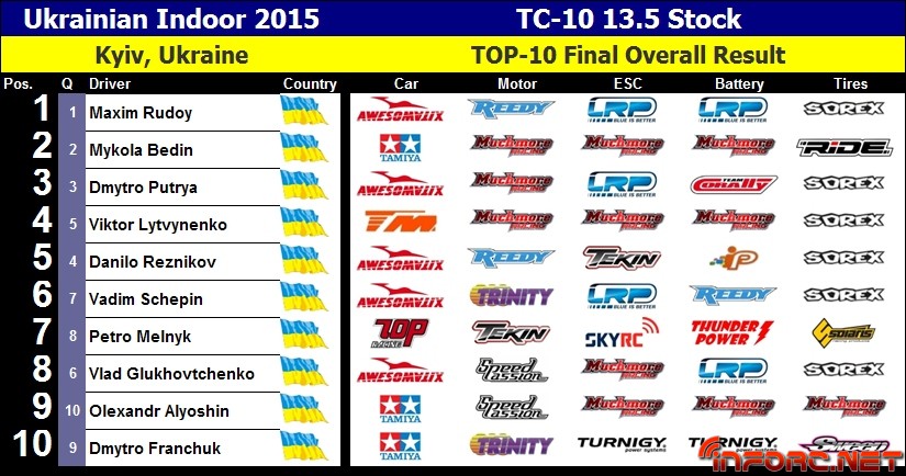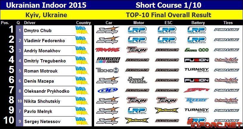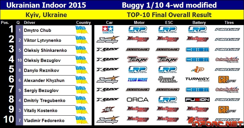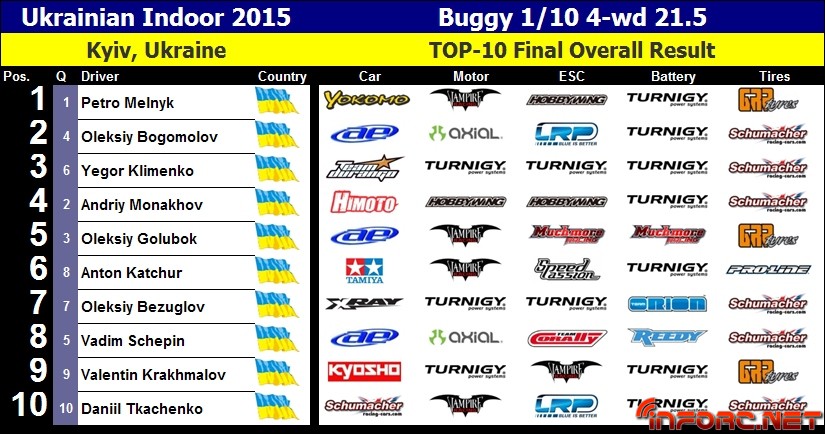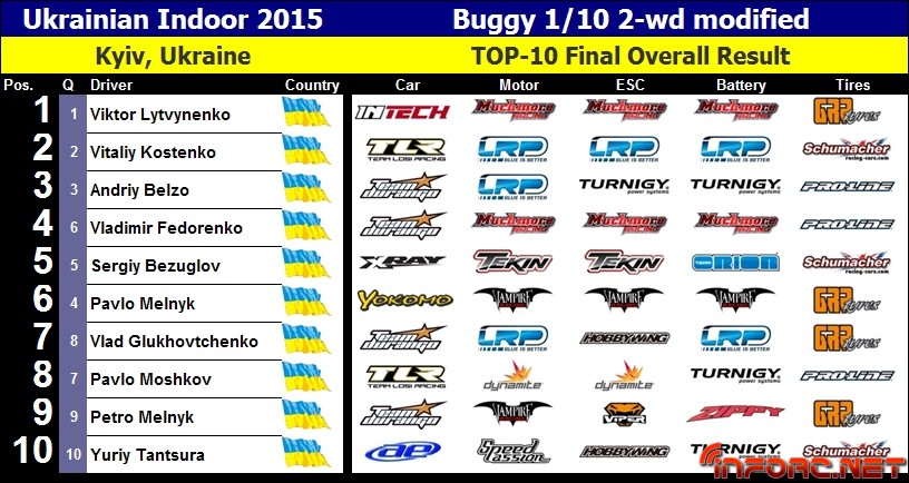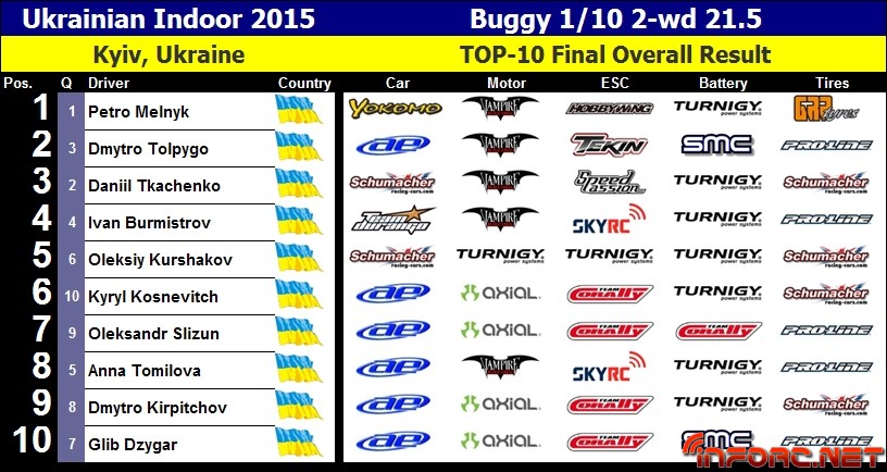 Pavlo Melnyk nos remite desde Ucrania los resultados del Campeonato nacional que ha tenido lugar este fin de semana. Se trata de un evento celebrado en unas instalaciones indoor, aunando en su interior campeonato tanto de on road como de off road, con 5 clases diferentes dentro de cada campeonato.