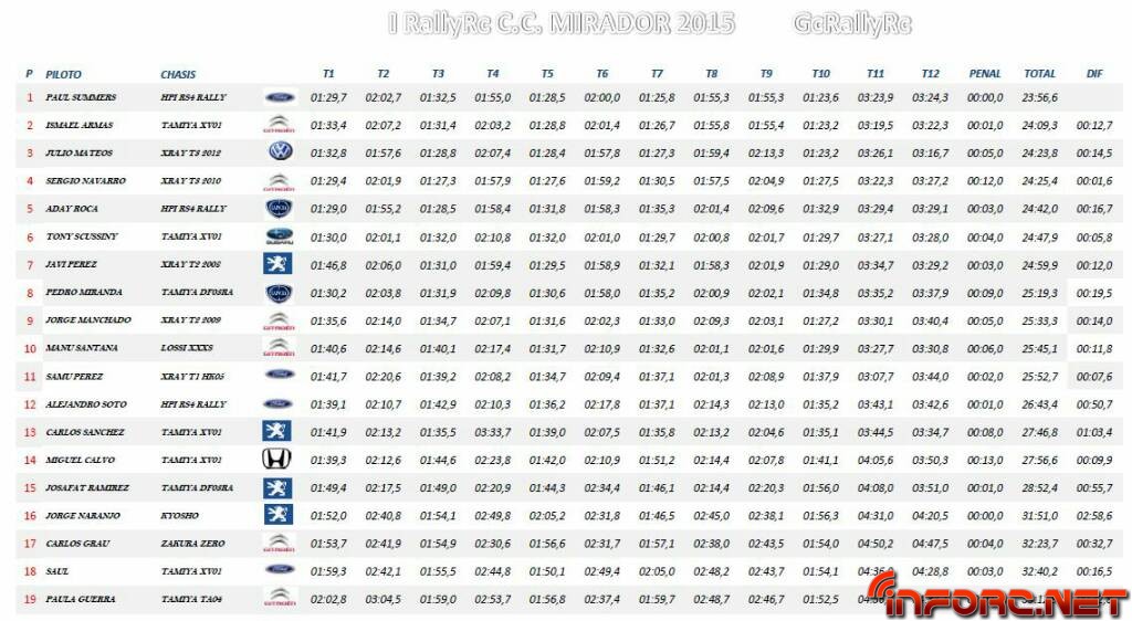 Pasaron verificaciones 19 pilotos, hemos ganado algunos que hacia tiempo que no competían y algunas nuevas incorporaciones. El Rally contó con 12 Tramos Cronometrados, ya como viene siendo habitual y gracias siempre a Sergio Olichencho y Carlos Grau con el programa que han diseñado, pudimos salir de minuto en minuto, y sobre todo en los dos últimas pasadas, que se unieron los tres tramos, se llegaron a ver hasta 4 coches en pista, todo un espectáculo.