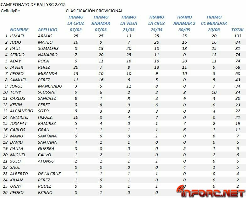 Otro piloto que empezó bastante descolgado con unos tiempos bastante mediocres debido a unos reglajes pocos afortunados fué Ismael Armas, el actual líder del campeonato que empezaba en la primera parte de la prueba hacia la mitad de la tabla. Pero en la segunda etapa corrigió esos malos reglajes y empezó a* hacer tiempos de locura, lo cual le sirvieron para subir hasta el segundo puesto de la general. Y en primera posición, también empezando de menos a más Paul Guerra, el actual campeón en titulo, se hizo con la primera victoria del año para el, distanciado del segundo a 12 segundos. Muy bonita esa lucha entre el podium, sin olvidarnos de Sergio que también hizo un Rallye fantástico y solo pudiendo escalar hasta esa cuarta plaza.