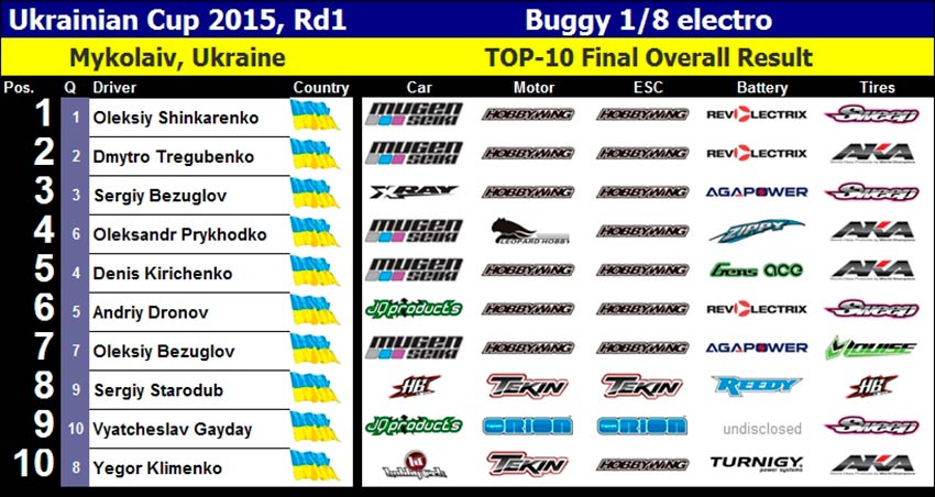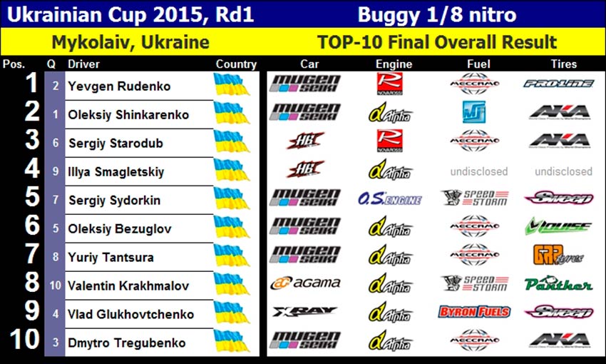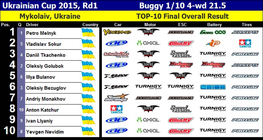 La primera prueba de la Copa Ucraniana Off Road 2015 se celebró en Mykolaiv, siendo un evento de dos días en los que competirían coches de 1/10 y 1/8 en un circuito de poco agarre, que este año requería una conducción muy precisa por parte de los 85 asistentes.