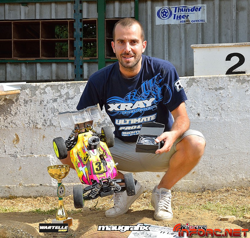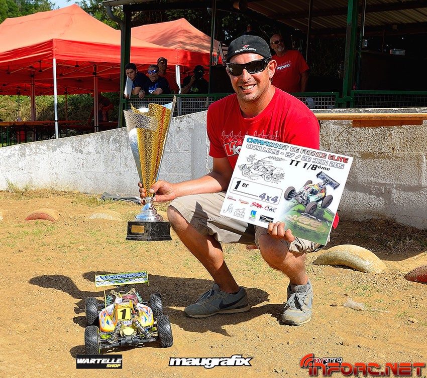 Este fin de semana se ha celebrado en Normandía la cuarta prueba del Campeonato de Francia 1/8 TT Gas 2015 y Jerome Aigoin se llevó el primer puesto, seguido de Yannick Aigoin y Edouard Hougon en un circuito dificil debido a los baches y el polvo. Ese segundo puesto de Yannick le proporcionó además los puntos suficientes que necesitaba para alzarse como ganador del Campeonato.