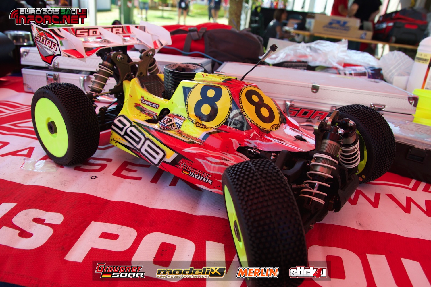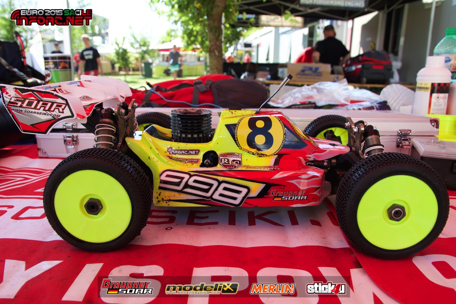 Ayer anunciábamos el fichaje de Dani Bernabé por SP Tires y hoy os traemos cómo es por dentro su Soar 998 tal como lo utilizó en el Campeonato de Europa 1/8 TT Gas 2015 celebrado en Sacile, Italia. Atentos a los topes de recorrido de amortiguador hechos en aluminio y con cabeza redondeada para evitar que desgasten el chasis; al fin y al cabo es más barato cambiar los topes que el chasis ¿no? 😀