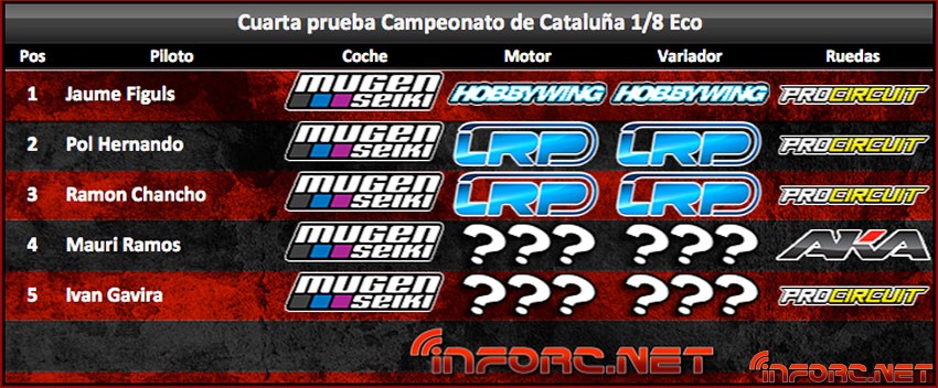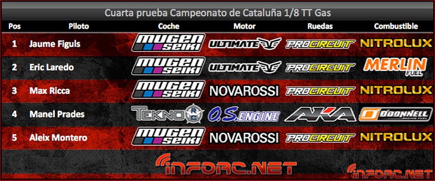 El pasado fin de semana se ha disputado la 4 Prueba del Campeonato de 1/8TT GAS en el circuito de Alcarrás, donde el primer y segundo clasificado acabaron a 3 segundos tan solo uno del otro. Jaume Figuls se ha proclamado por 4 vez Campeón de Cataluña, conviertiéndose en el piloto con más títulos de Campeón de Cataluña, por delante de Robert Batlle con 3.