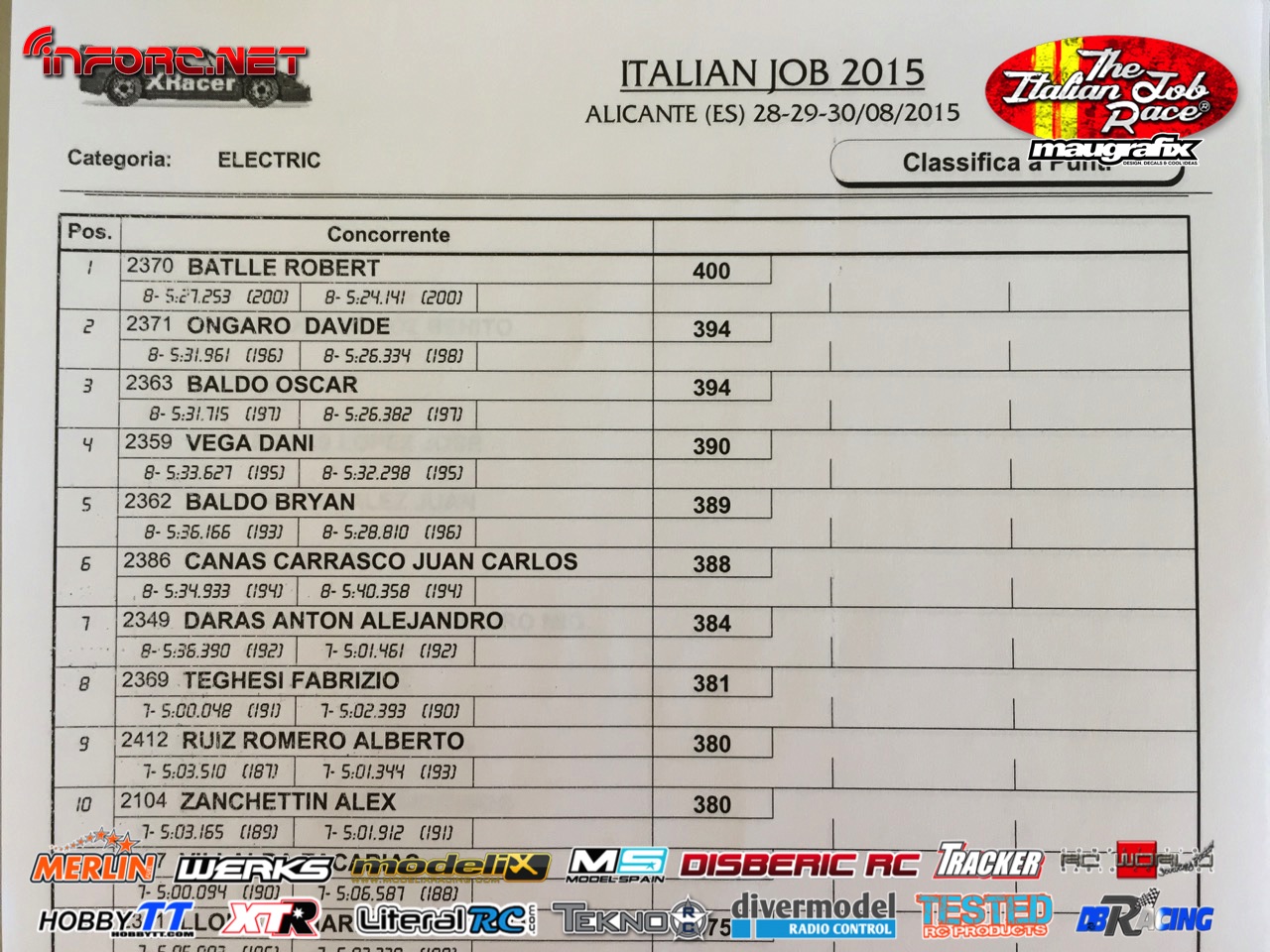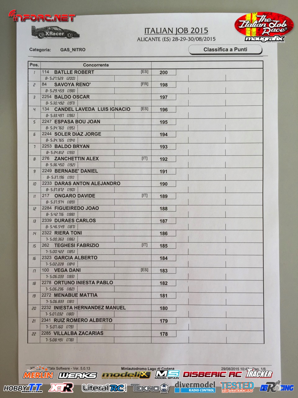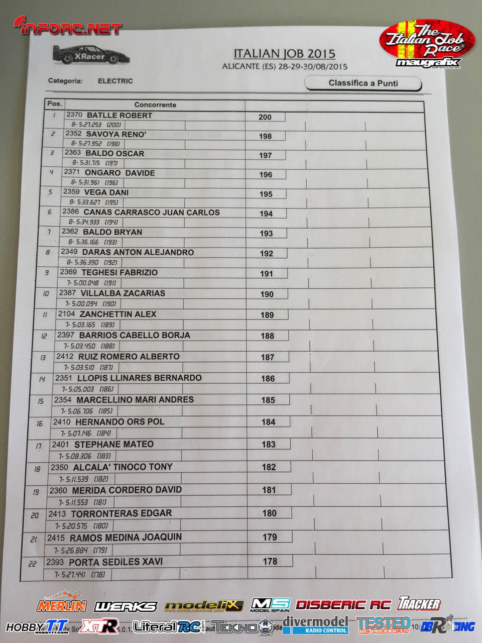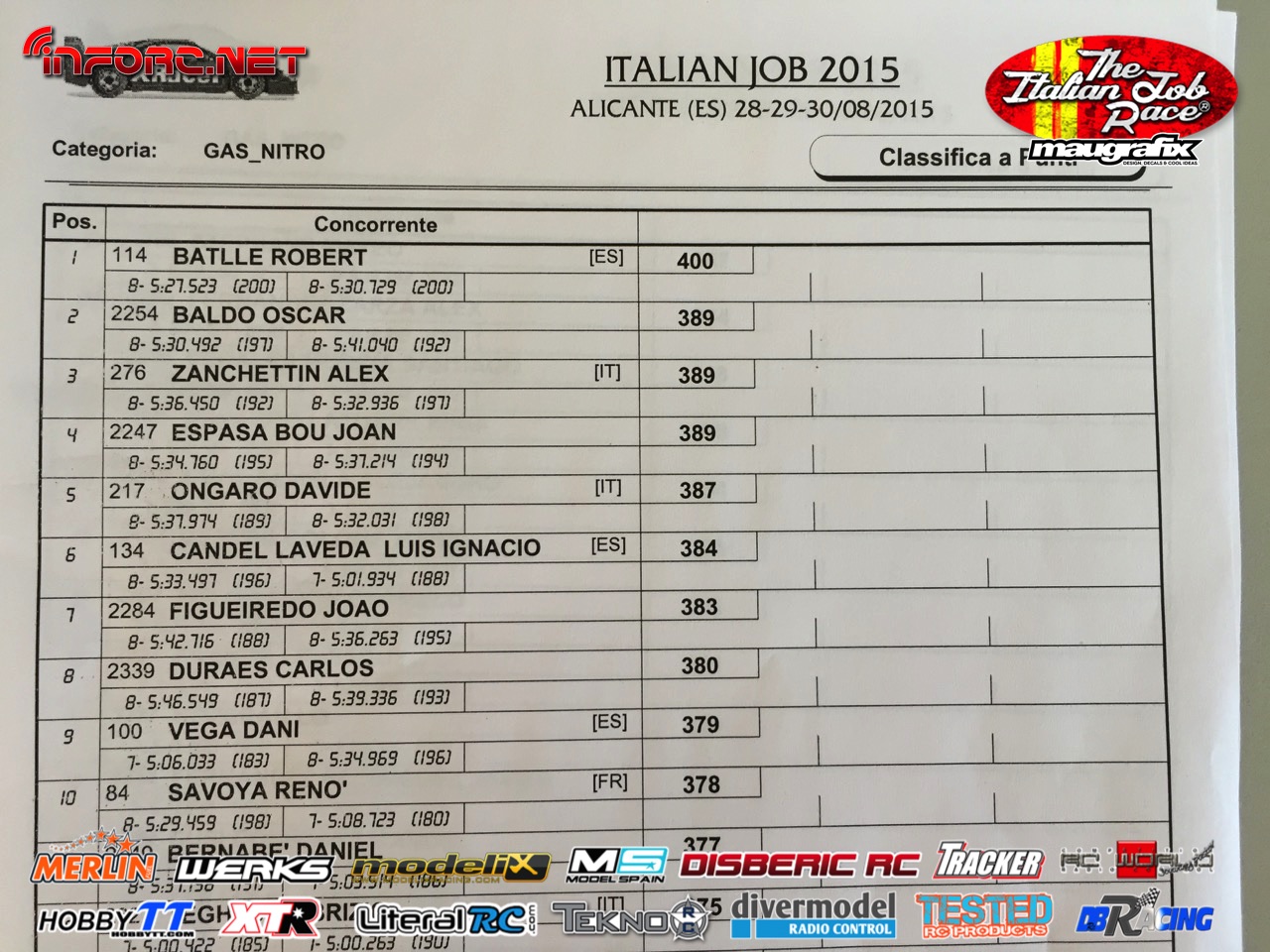 No debemos perder de vista a los hermanos Baldó, con Oscar que ya ganó aquí una prueba del Nacional 1/8 tt gas de este año, Davide Ongaro que está demostrando ser muy rápido en su adaptación a nuevos circuitos, Alex Zanchettin que es otro italiano muy rápido y otros grandes como Savoya, Daras, Vega, Candel o incluso el joven Canas.