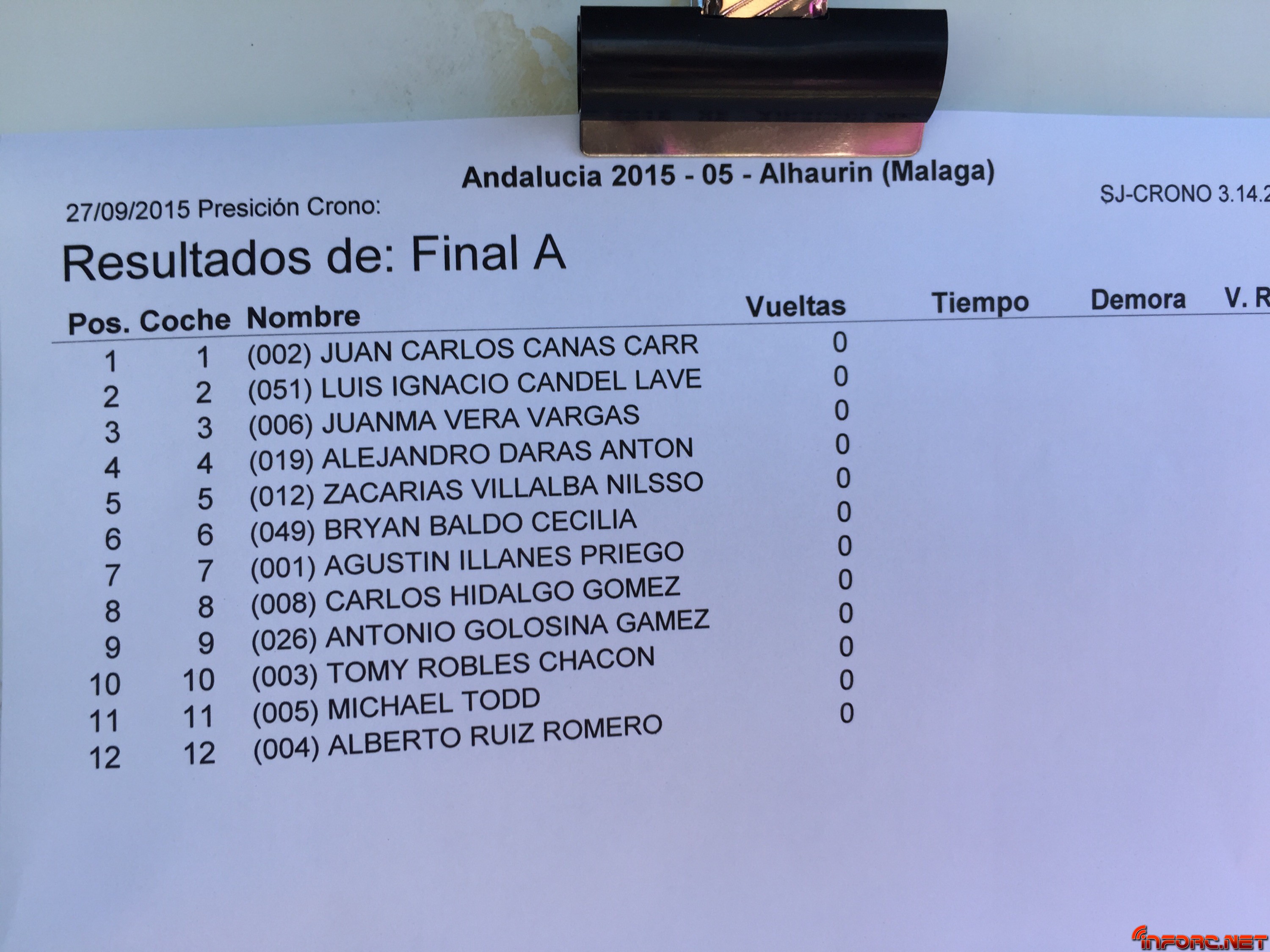 Hoy comienzan las subfinales previas a la gran final, de esta última prueba del Campeonato de Andalucía 1/8 TT Gas 2015, que se celebra este fin de semana en Alhaurín de la Torre. Os dejamos con las parrillas de salida de cada subfinal y la general de mangas de ayer, donde Juan Carlos Canas, uno de los dos aspirantes al título, se llevó la pole. Su rival más cercano en el Campeonato, Juanma Vera, consiguió una modesta 9ª plaza.