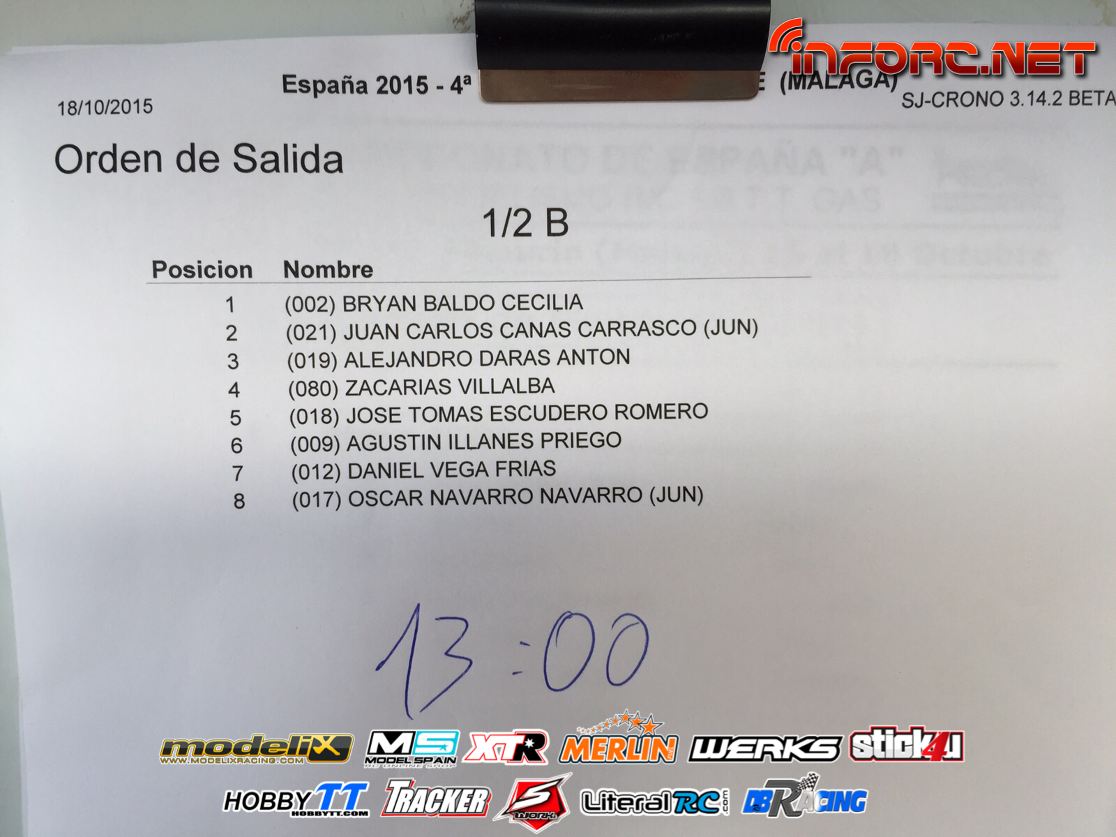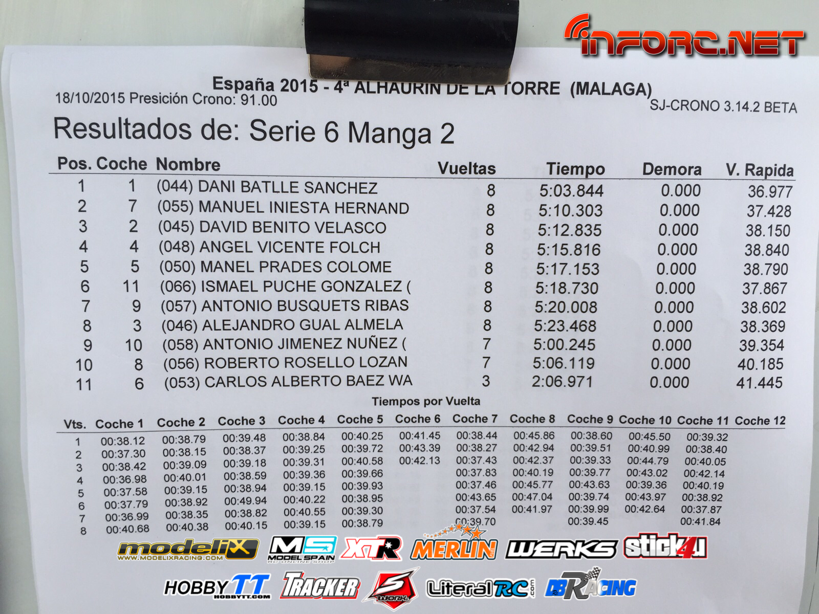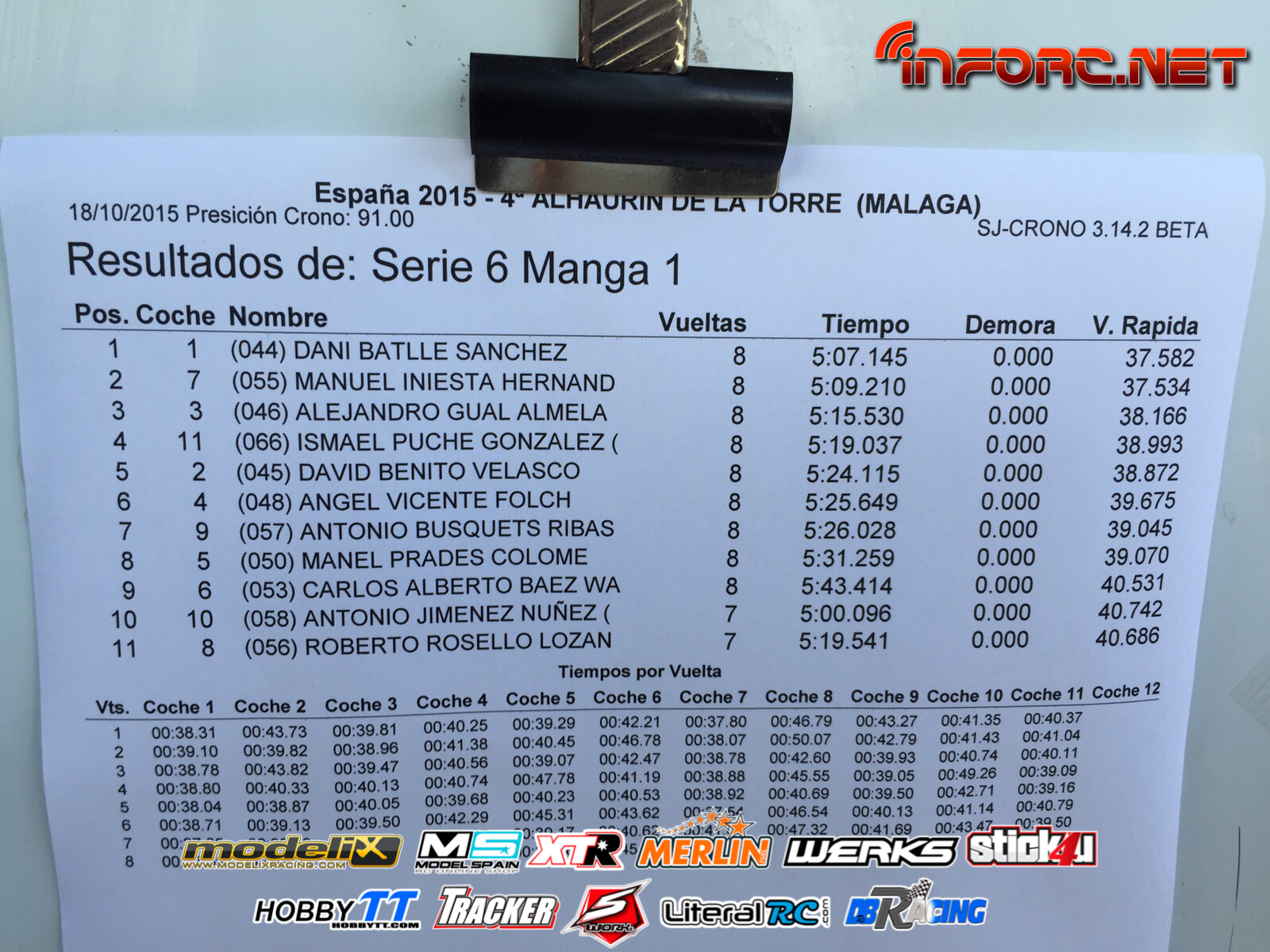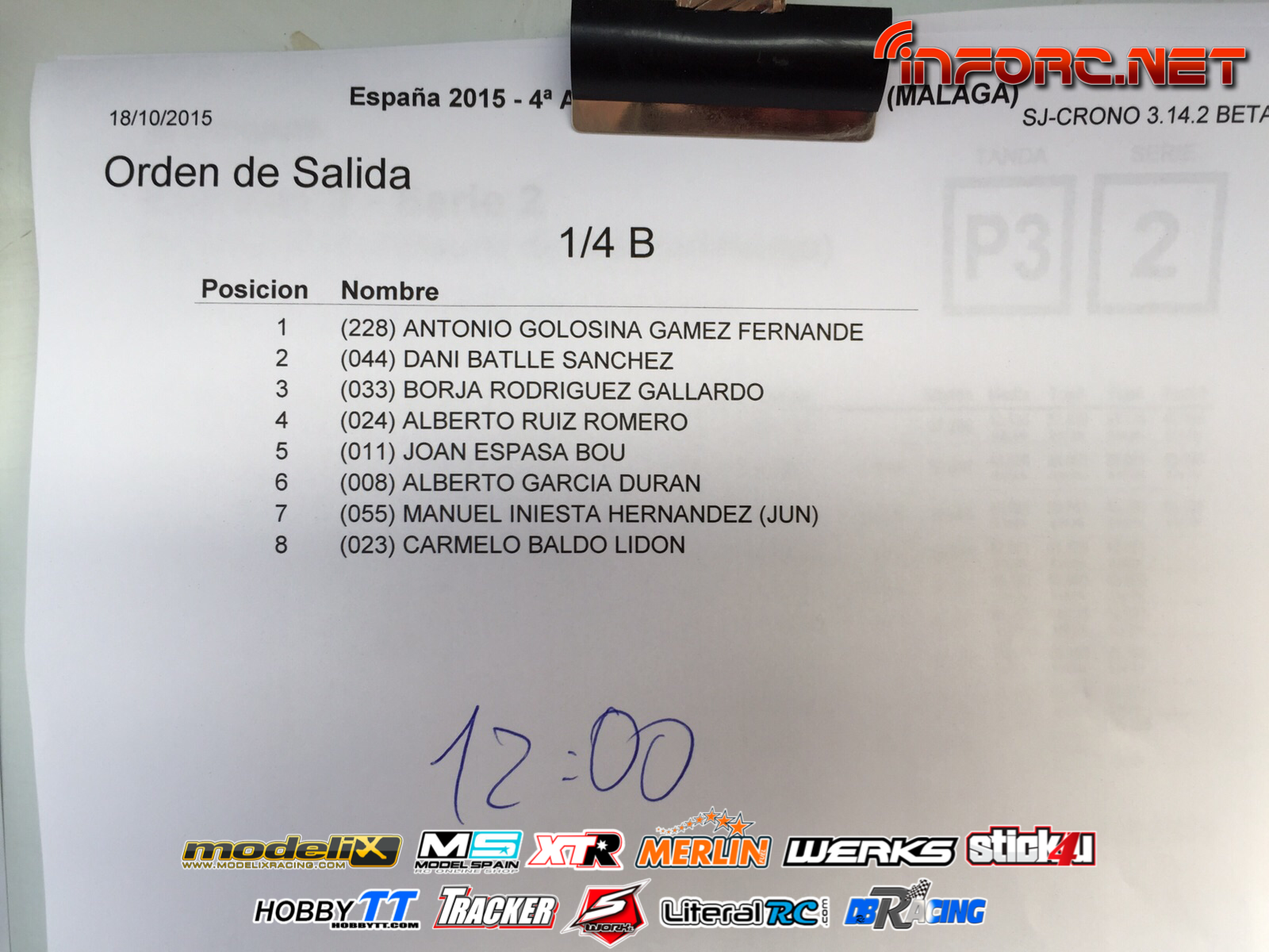 ACTUALIZADO A LAS 15:10 – tiempos de la Q2, en la que Bryan Baldo ha hecho la pole, seguido de Batlle y tercero, Juan Carlos Canas. La climatología en Málaga ha empeorado con un chispeo leve pero constante, que amenaza con convertirse en lluvia intensa durante la noche. Si esto sucediese, las mangas clasificatorias serían cruciales para el resultado final.