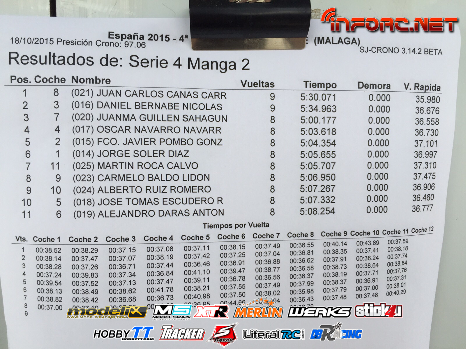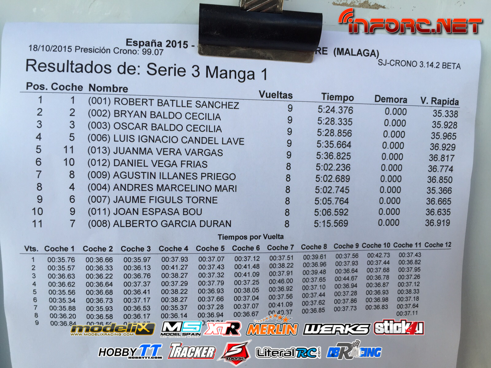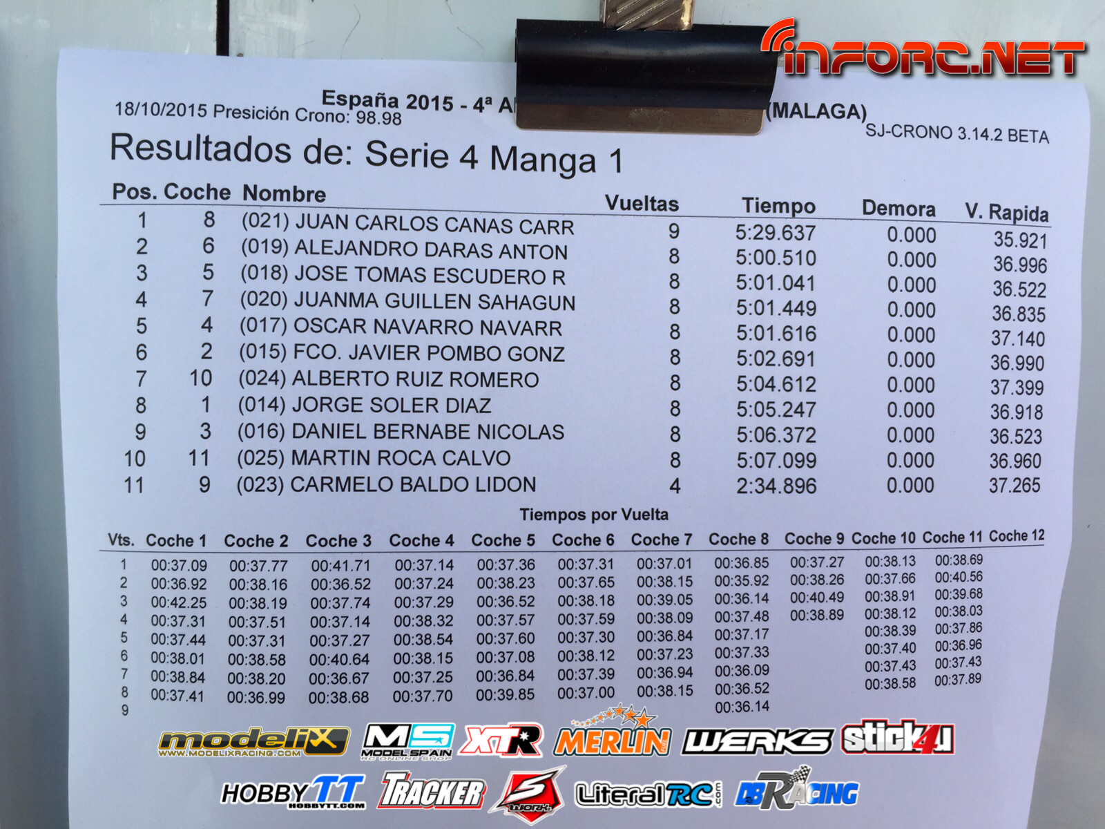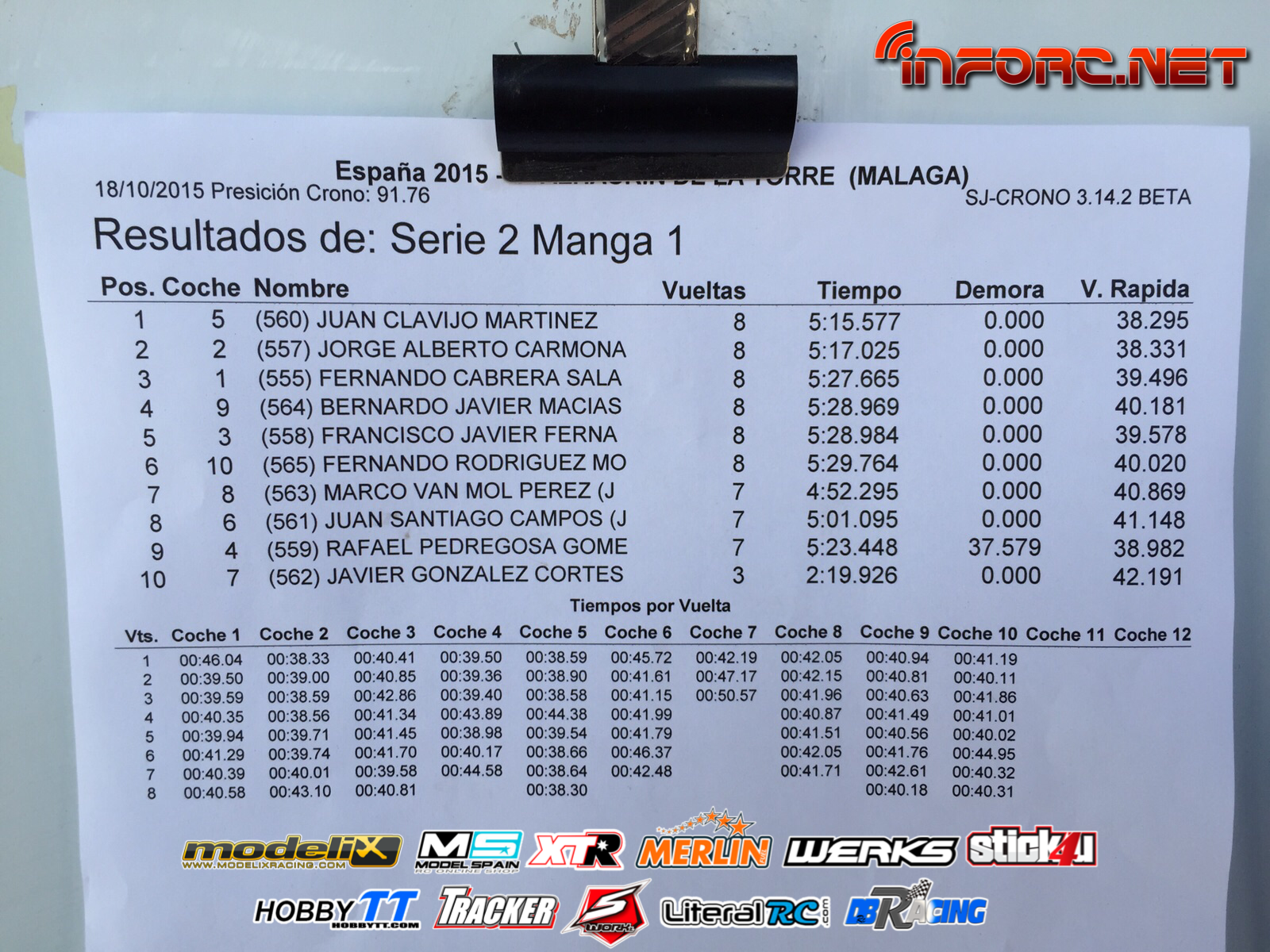 ACTUALIZADO A LAS 15:10 – tiempos de la Q2, en la que Bryan Baldo ha hecho la pole, seguido de Batlle y tercero, Juan Carlos Canas. La climatología en Málaga ha empeorado con un chispeo leve pero constante, que amenaza con convertirse en lluvia intensa durante la noche. Si esto sucediese, las mangas clasificatorias serían cruciales para el resultado final.