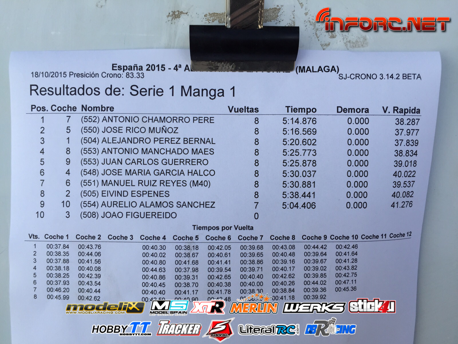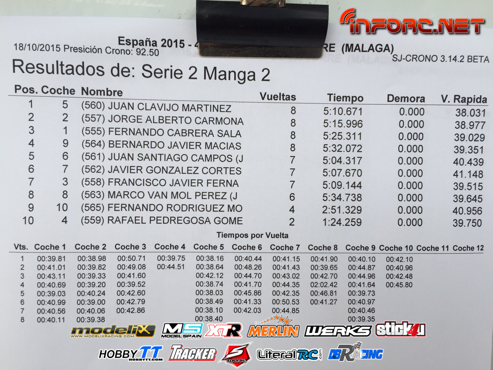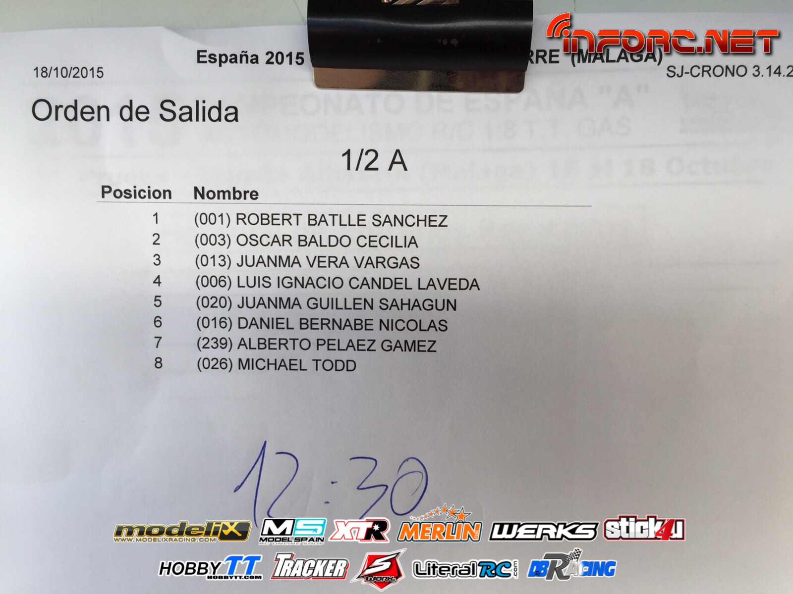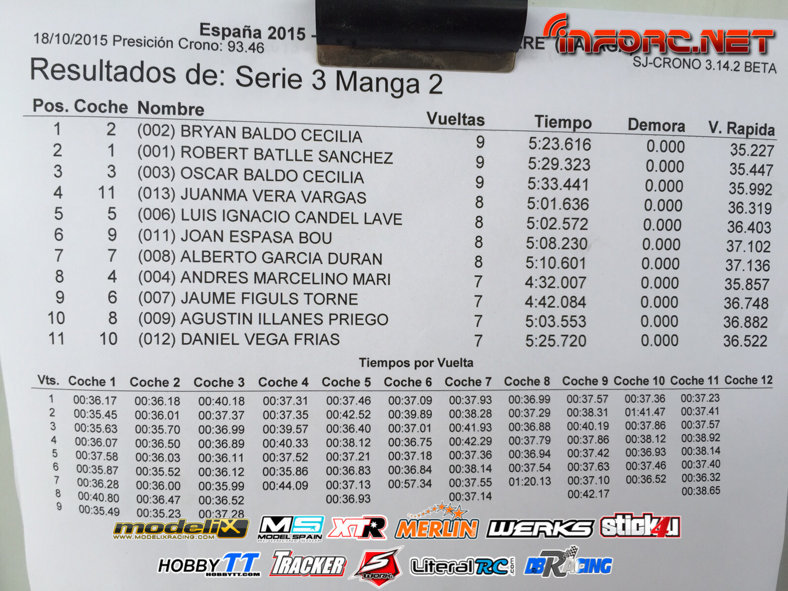 ACTUALIZADO A LAS 15:10 – tiempos de la Q2, en la que Bryan Baldo ha hecho la pole, seguido de Batlle y tercero, Juan Carlos Canas. La climatología en Málaga ha empeorado con un chispeo leve pero constante, que amenaza con convertirse en lluvia intensa durante la noche. Si esto sucediese, las mangas clasificatorias serían cruciales para el resultado final.