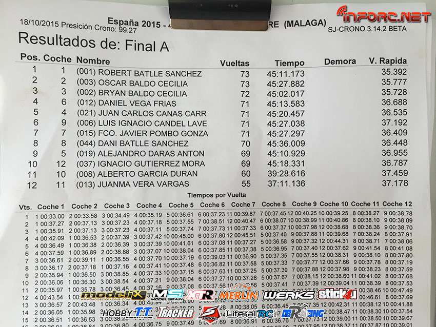 En una final apasionante, en la que la primera posición ha estado sin definir durante los 25 minutos iniciales de carrera, alternándose con magníficos piques entre los tres más rápidos del fin de semana, Robert Batlle, Oscar Baldó y Bryan Baldó. Además de estos piques en cabeza, ha habido otras bonitas luchas por la posición, como la de Javi Pombo e Ignacio Candel, que ha durado hasta el mismísimo paso por meta de la última vuelta. Dani Vega y Juan Carlos Canas son otro de los piques a destacar, haciendo mención especial a Dani Batlle, que hoy ha disputado su primera final de un campeonato de España y que también ha protagonizado bonitas luchas durante la final, entre otros, con Alex Darás. También el junior Ignacio Gutierrez ha disputado hoy su primera final de un nacional ¡enhorabuena!