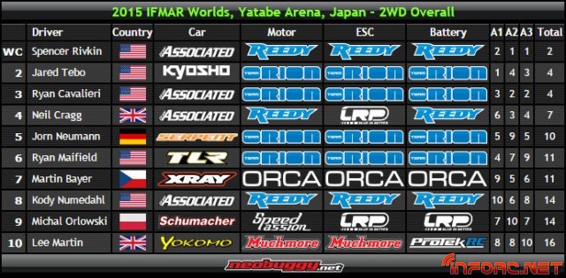 Tras haber destacado sobradamente en la recta inicial de este mundial, parecía que Jared Tebo iba a ser quien se alzase sin rival alguno con el título de Campeón del mundo 1/10 2WD. Aunque ya en las mangas comenzó a tenerlo algo más dificil debido a un Neil Cragg que pudo conseguir la pole en alguna de las clasificatorias, finalmente fue Tebo quien se llevó la pole en la general de mangas, afianzando un poco más su posición de superioridad, con el Kyosho prototipo con el que ha estado compitiendo.