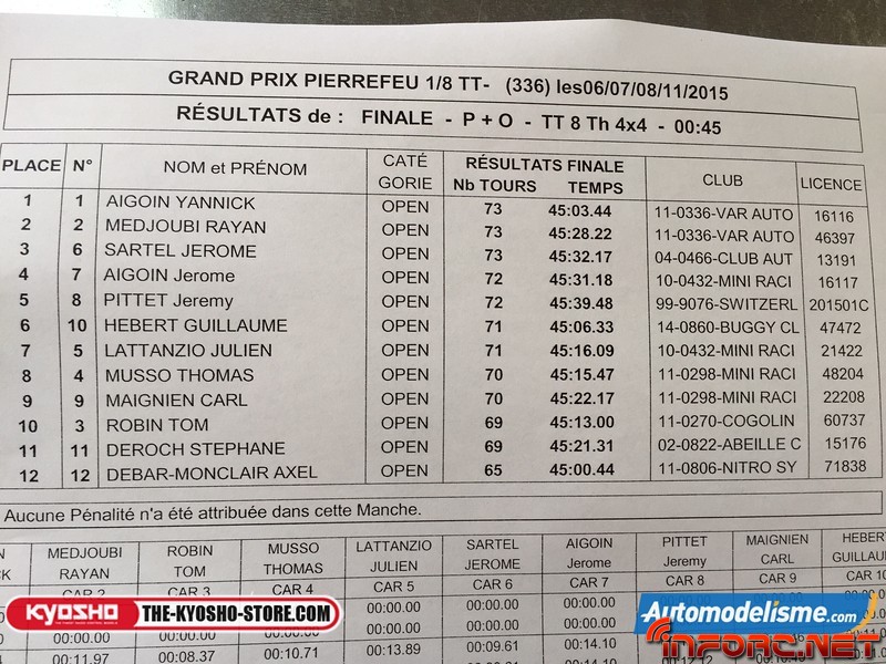 Nuestros amigos franceses de Automodelisme nos informan del resultado del GP de Pierrefeu, celebrado este fin de semana. Yannick Aigoin (XRay, Ultimate) ha conseguido la pole en mangas clasificatorias y la victoria en la final, seguido de Rayan Medjoubi, de quien se rumorea que tal vez pueda ser su última carrera con JQ Products (nos lo anotamos en la libreta de rumores). Jerome Sartel completó el podium.