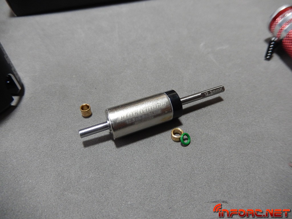 Sacamos el rotor, diferente a los demás de la serie Fleta ZX, con la parte frontal incluyendo un disco para su equilibrado. Los casquillos situan en el lugar adecuado al rotor y la tórica verde ejerce de amortiguador, para que en las solicitaciones de potencia y en las transiciones de potencia a frenado, el desplazamiento axial no golpee los rodamientos. En el eje delantero del rotor, se puede ver marcada la denominación del mismo.
