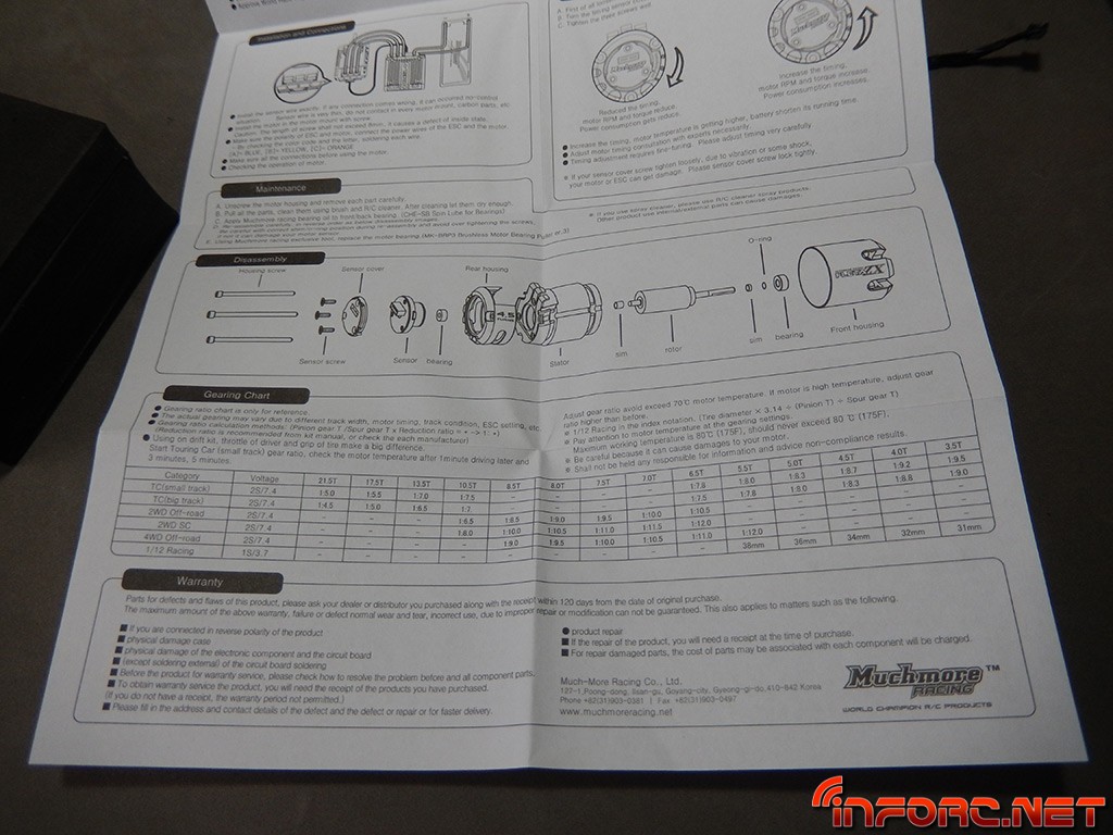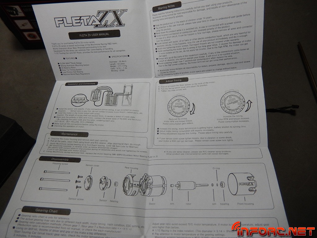 Finalmente, si miramos dentro de la caja, debajo de la espuma, encontramos el manual del motor. Ojeando el manual, los gráficos indican lo básico para que con un golpe de vista localicemos lo fundamental, practicamente sin leer. Y en la parte inferior una tabla con recomendaciones de ratio, pero son datos genéricos para toda la serie Fleta ZX, nada específico de la gama Sting.