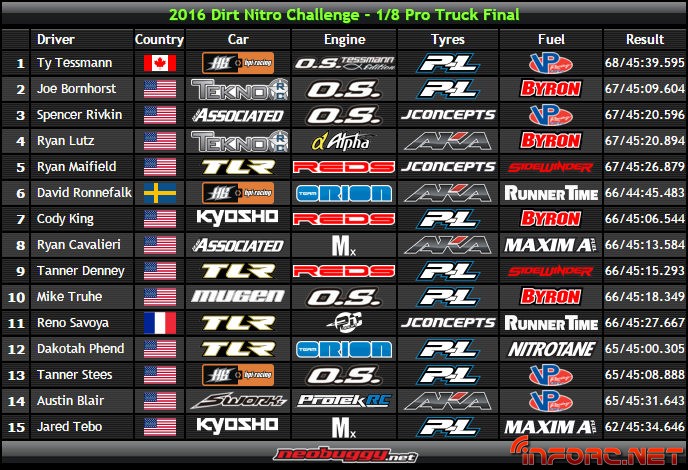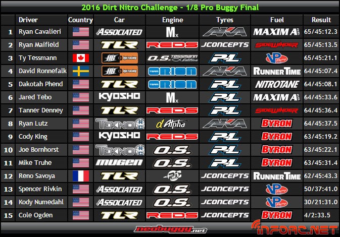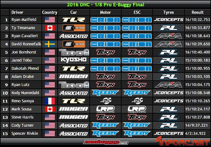 La DNC2016 ha llegado a su fin con más ganadores de los que parecía al principio, ya que el dominio de Maifield con la TQ en todas las modalidades parecía que iba a dejar poco lugar a luchas en las finales. Sin embargo, Maifield solo se lleva a casa la primera plaza de la modalidad 1/8 TT Eco, siendo la victoria en 1/8 TT Gas para Cavalieri y en 1/8 Truggy para Tessmann.