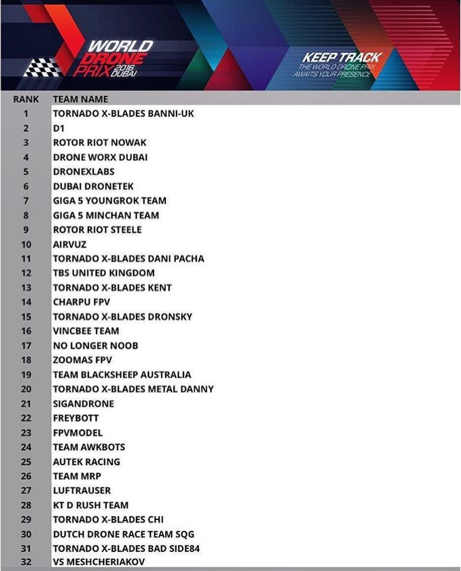 De los 200 equipos participantes a este impresionante evento que está celebrándose en las instalaciones de Skydive Dubai, tan solo 32 han conseguido el acceso a la gran final de entre los cuales, tenemos el orgullo de contar con dos españoles. El mejor clasificado ha sido Andrés Aguilera (oficial SLS) y su equipo Dronexlabs, que ocupa la quinta posición de la tabla y a tan solo unos puestos, en el 11, encontramos a Dani Pacha y su equipo Tornado X-Blades. El evento principal comenzará el Viernes 11 a las 12 hora española y se celebrará en el espectacular circuito de carreras que os dejamos en este vídeo.